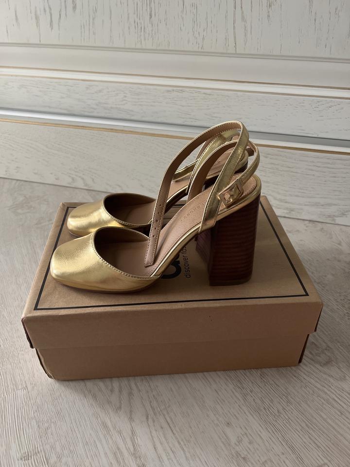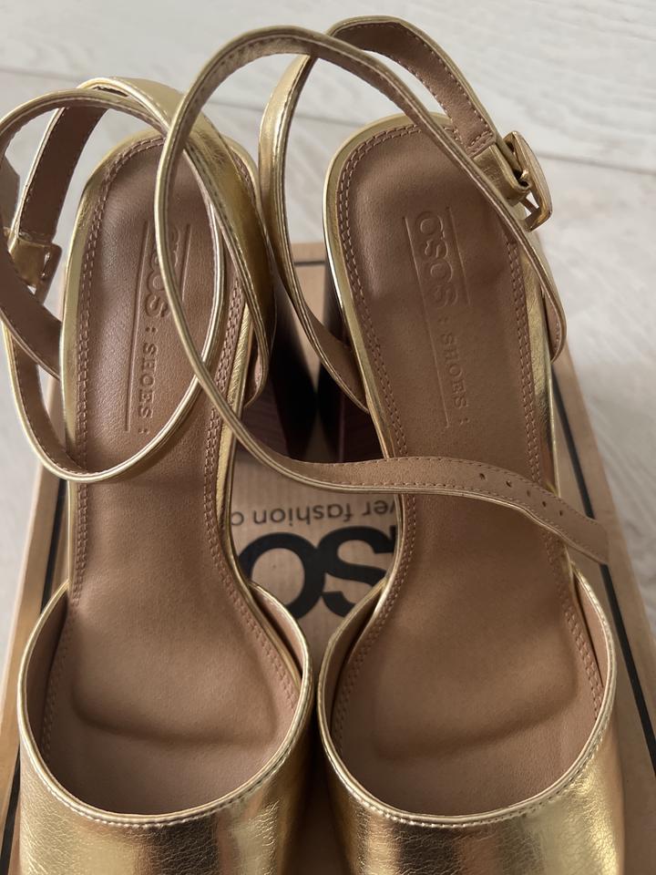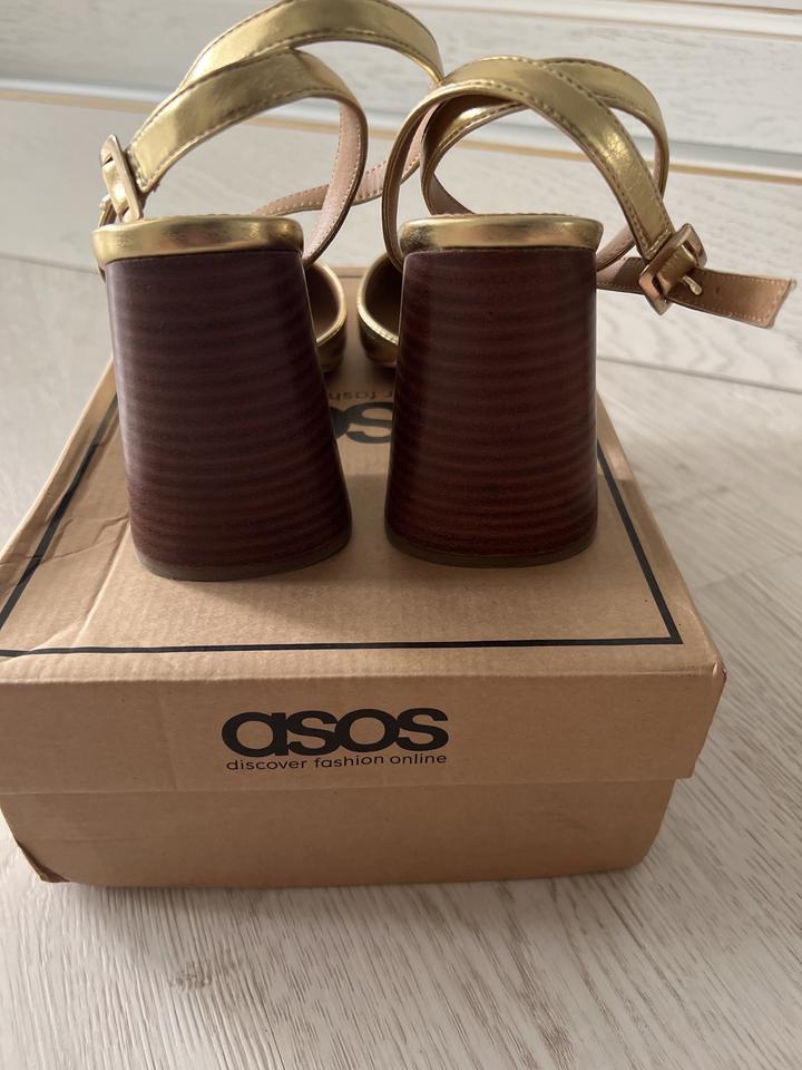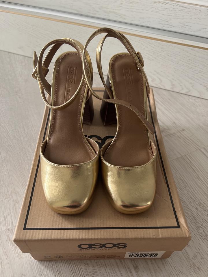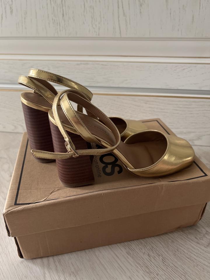 Продаются золотистые туфли Бренда ASOS. Очень удобные, нарядные, устойчивые каблук высотой 10 см. Одевались один раз на выход. Размер 36. цена 10000 тенге Артикул: 125920