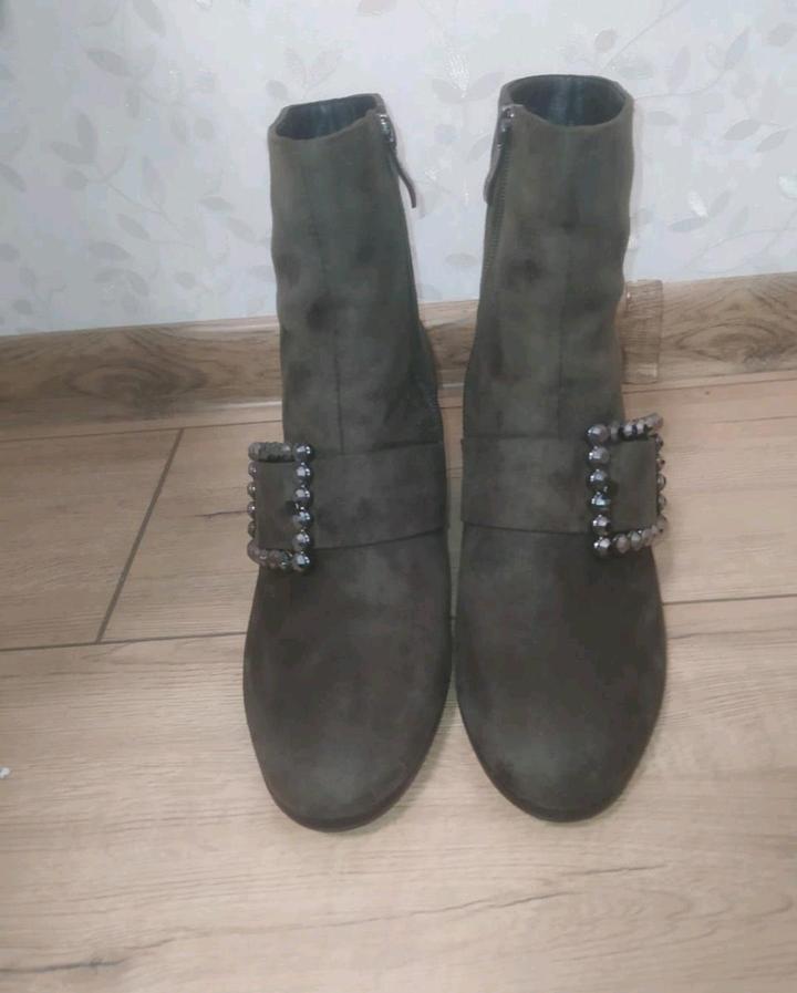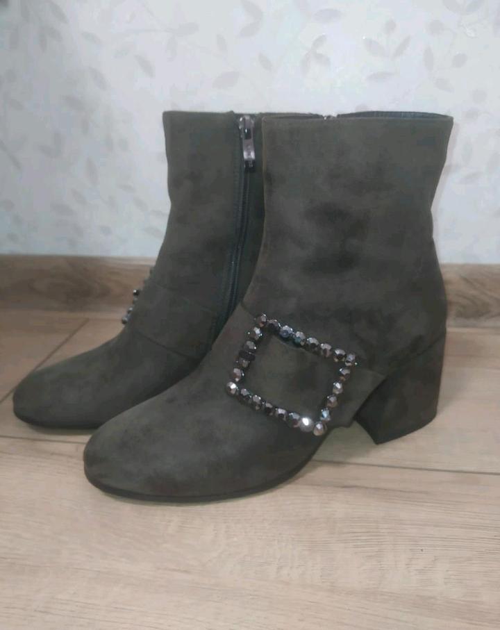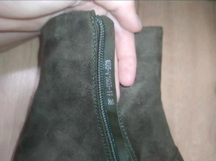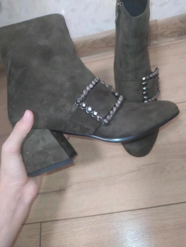 Классные демисезонные ботинки. Замша. Цвет тёмный хаки. Невероятно удобные. Новые. Размер 38. Идут размер в размер. Высота каблука 6 см. Артикул: 125865