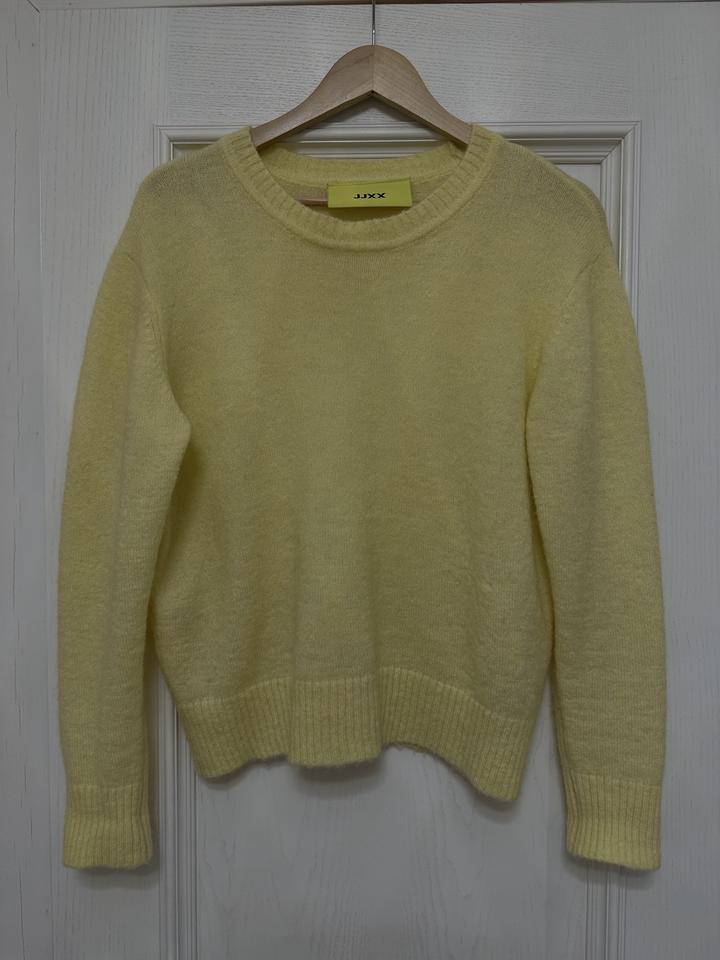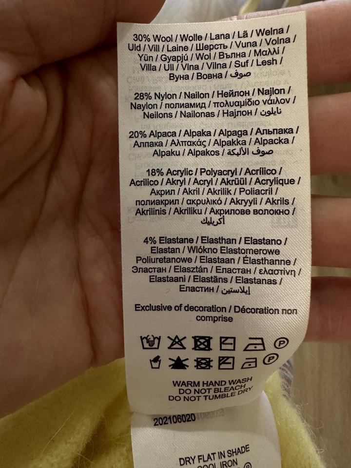 Нежнейший, невесомый женский свитер лимонного цвета. Состав 30% шерсть, 28% нейлон,20% альпака, 18% акрил,4% эластан.В прохладную погоду носила под пиджак, идеальная база. Сочетается со многими цветами и одеждой. Состав изделия идеальный! Очееень легкий и приятный к телу. Размер М, но на S тоже хорошо будет Артикул: 147129