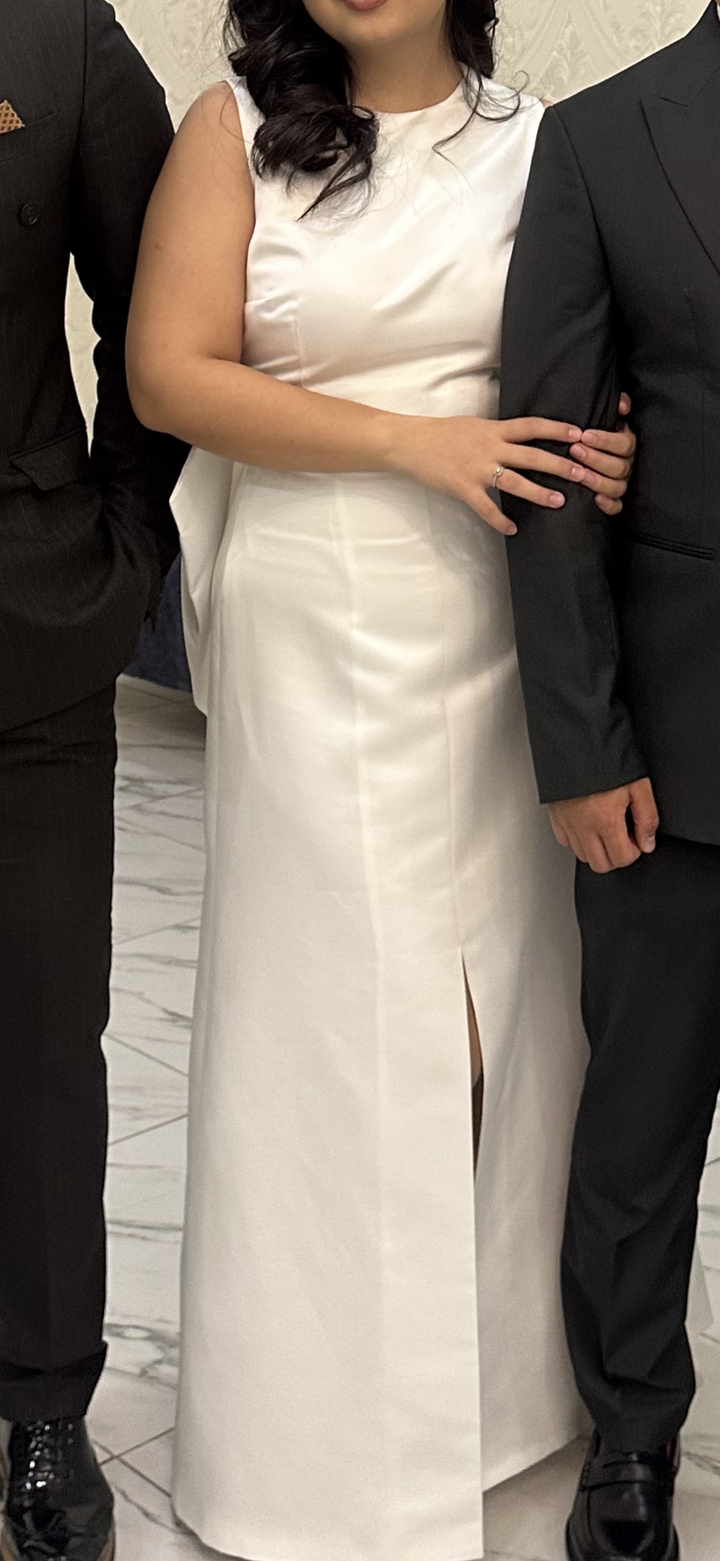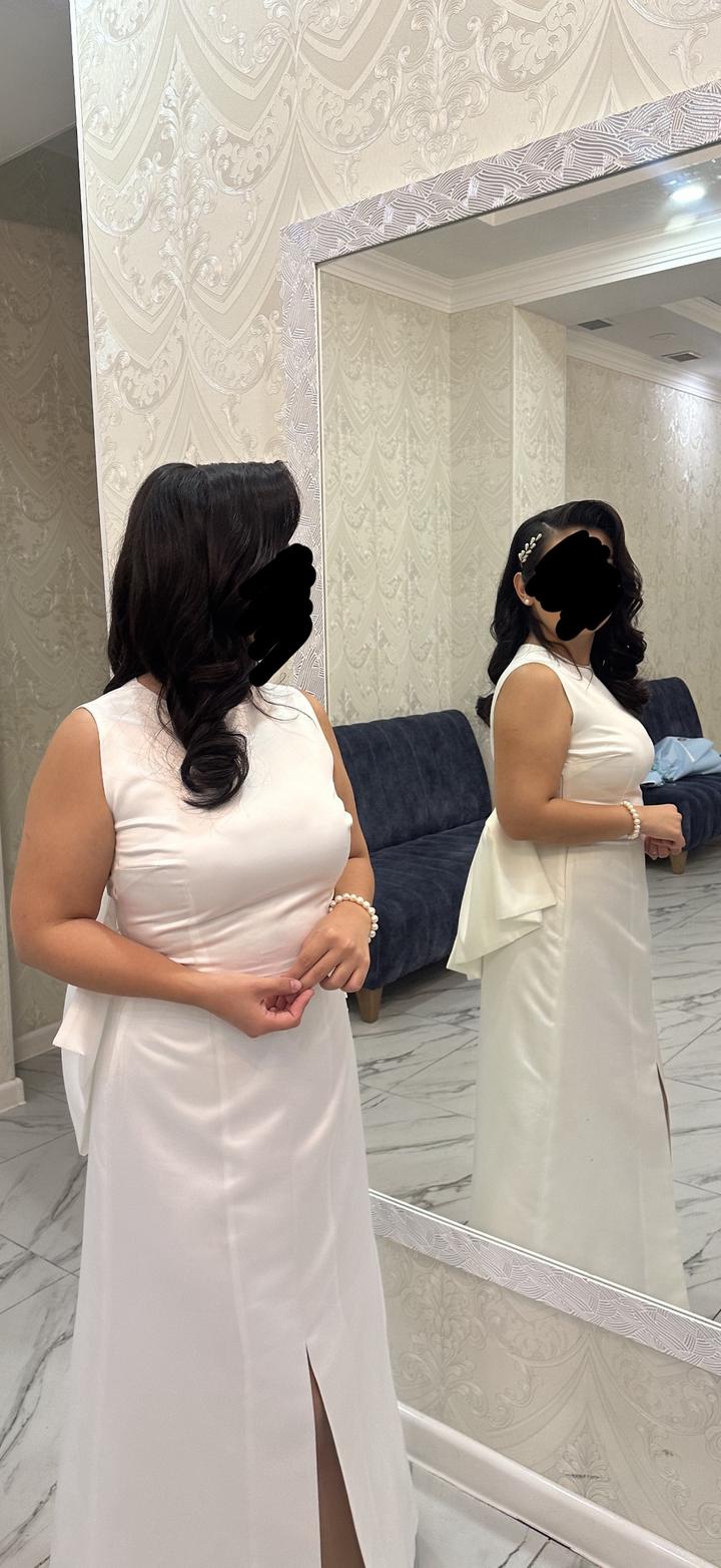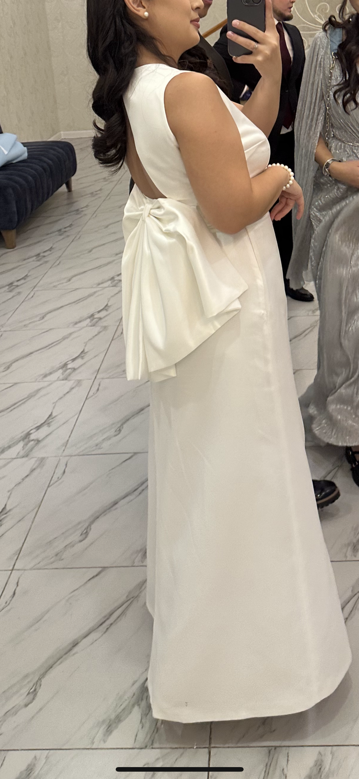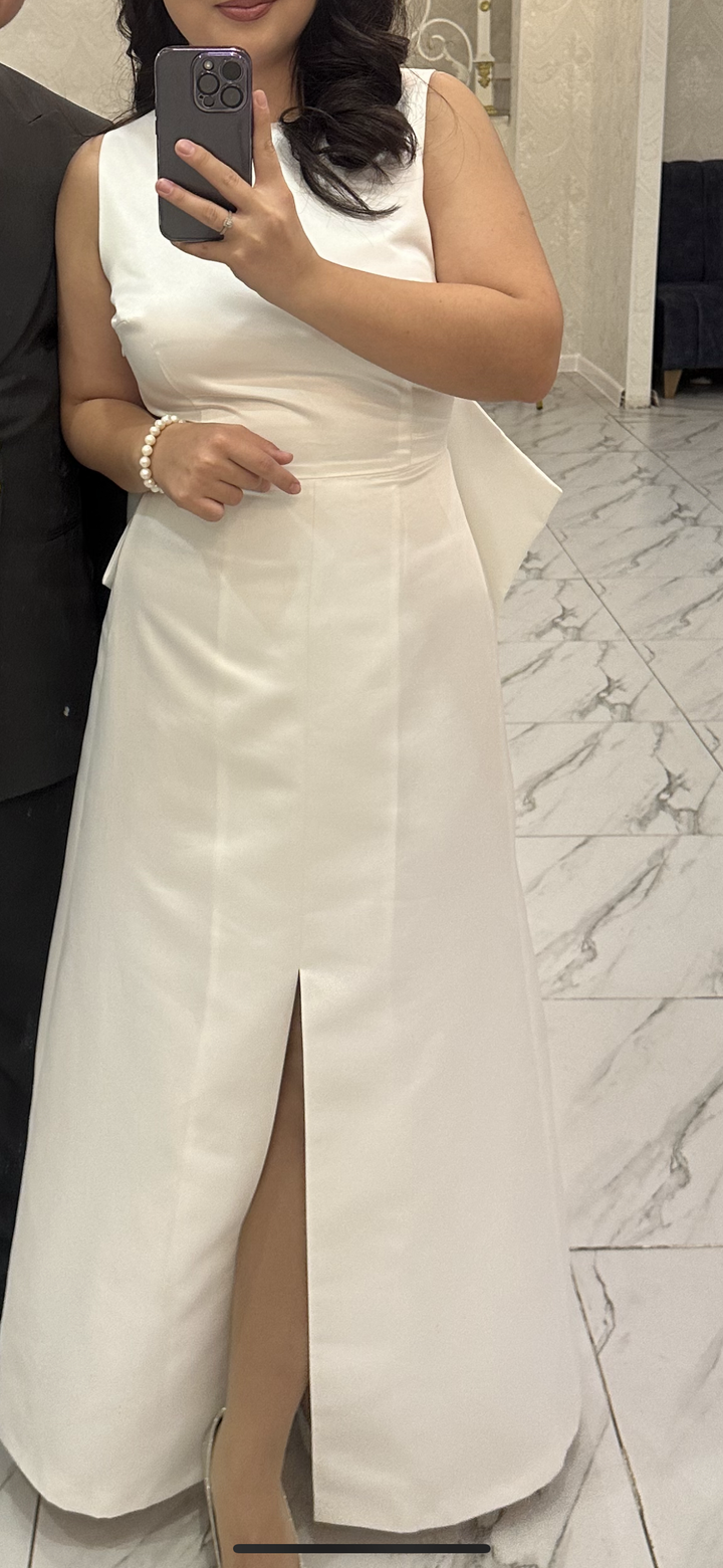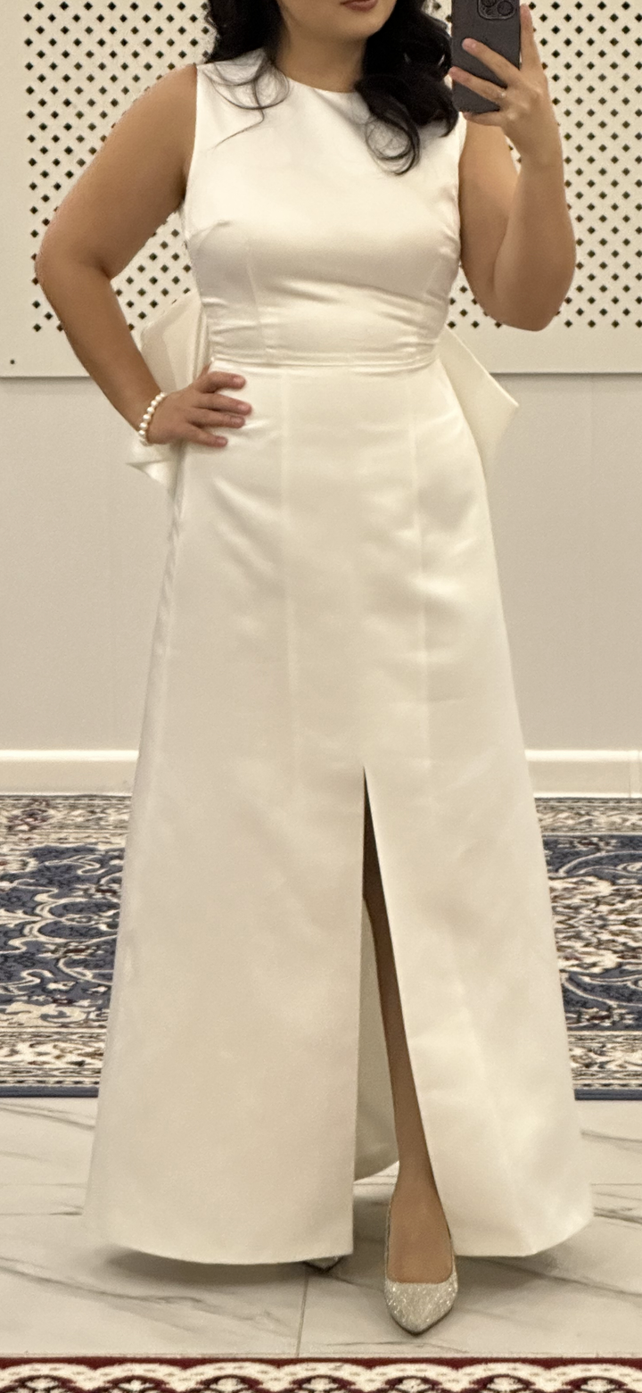 Свадебное платье сшитое на заказ на М размер. Рост 161. Вырез спереди, открытая спина, бант сзади. Айвори. Артикул: 147308