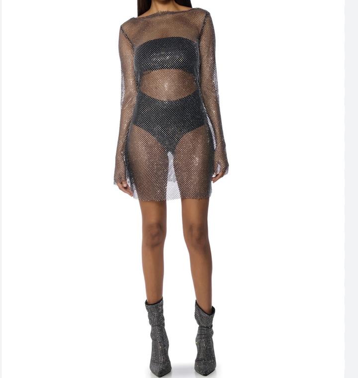 Короткое полупрозрачное платье из эластичной сетчатой ткани. Круглый вырез, длинные рукава и отделка стразами.есть небольшие дефекты… Модель без подкладки.ремень в подарок… Артикул: 152427