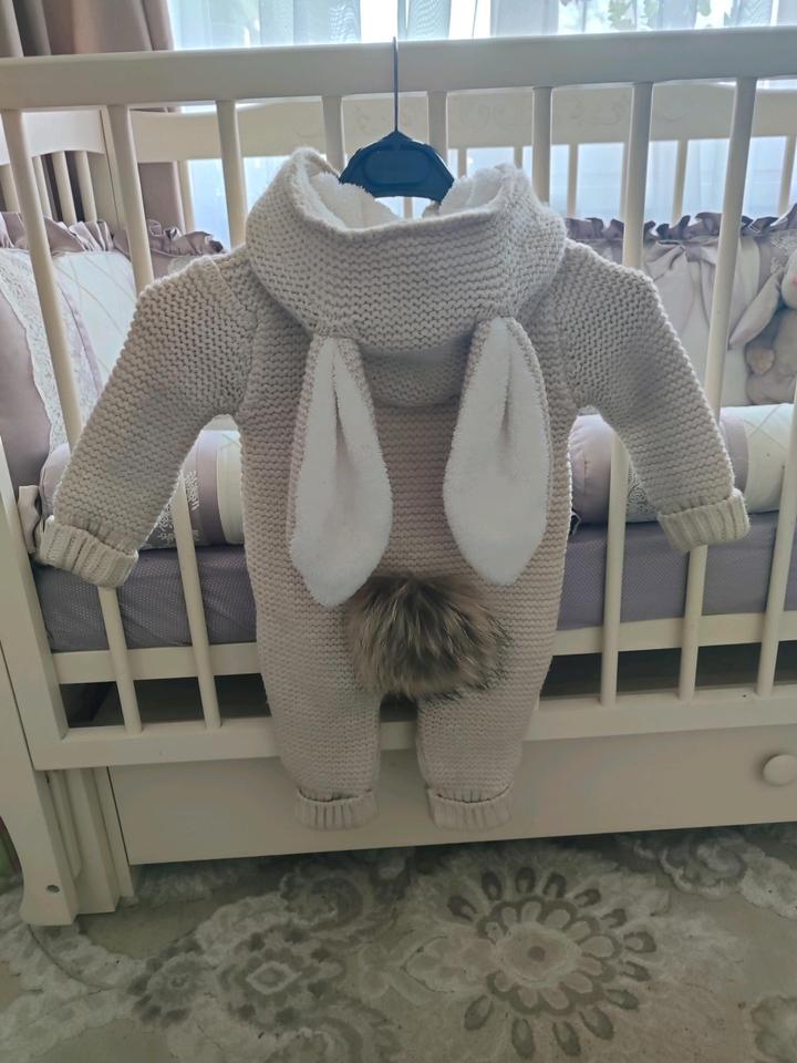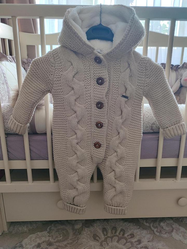 Вязаный комбинезон с утеплением в отличном состоянии, одевали раза 3. Возраст 9-12 месяцев, можно и раньше, производство Турция. Очень теплый, хвостик на кнопке, можно отстегнуть. Покупала осенью за 18000. Артикул: 153735