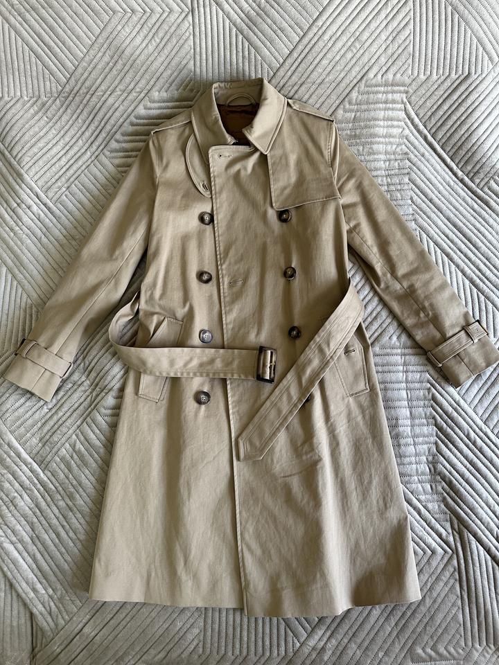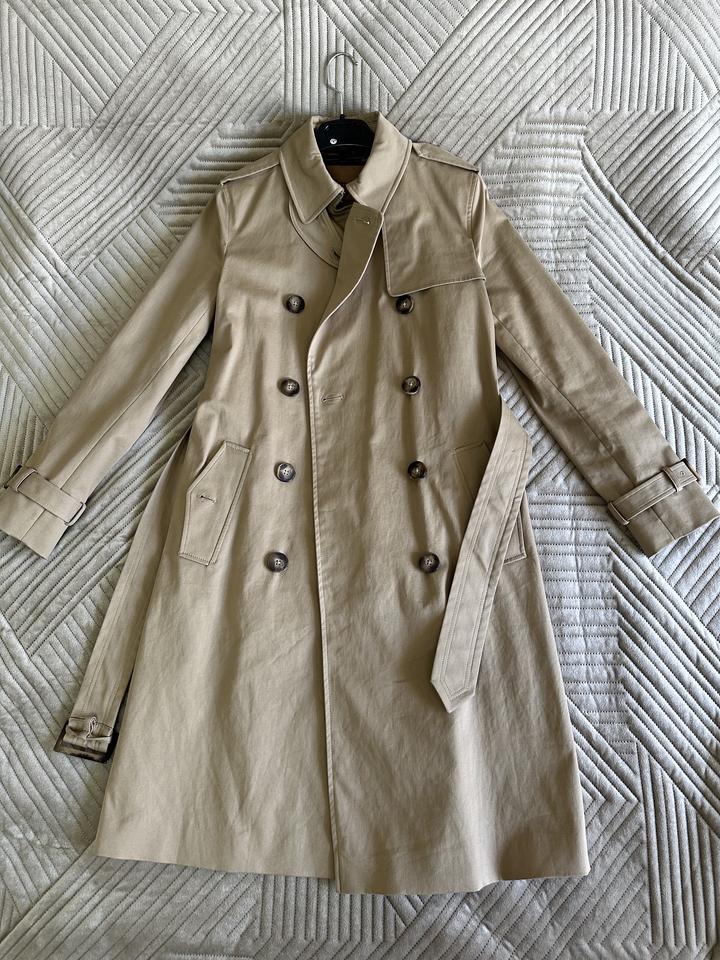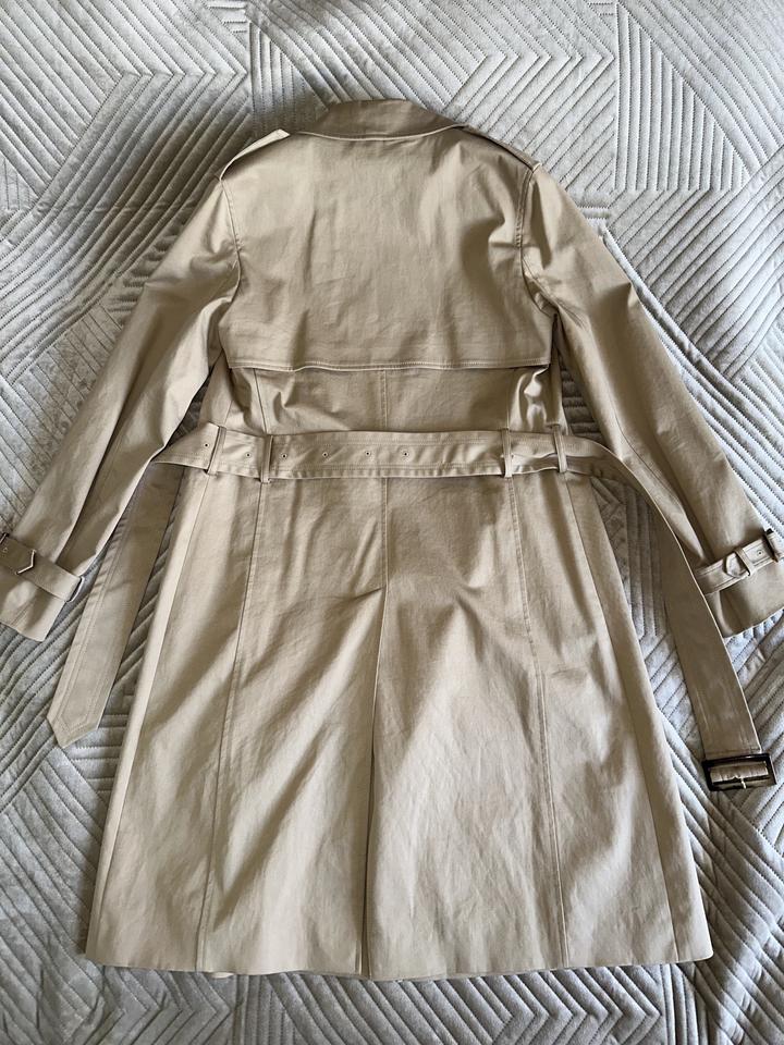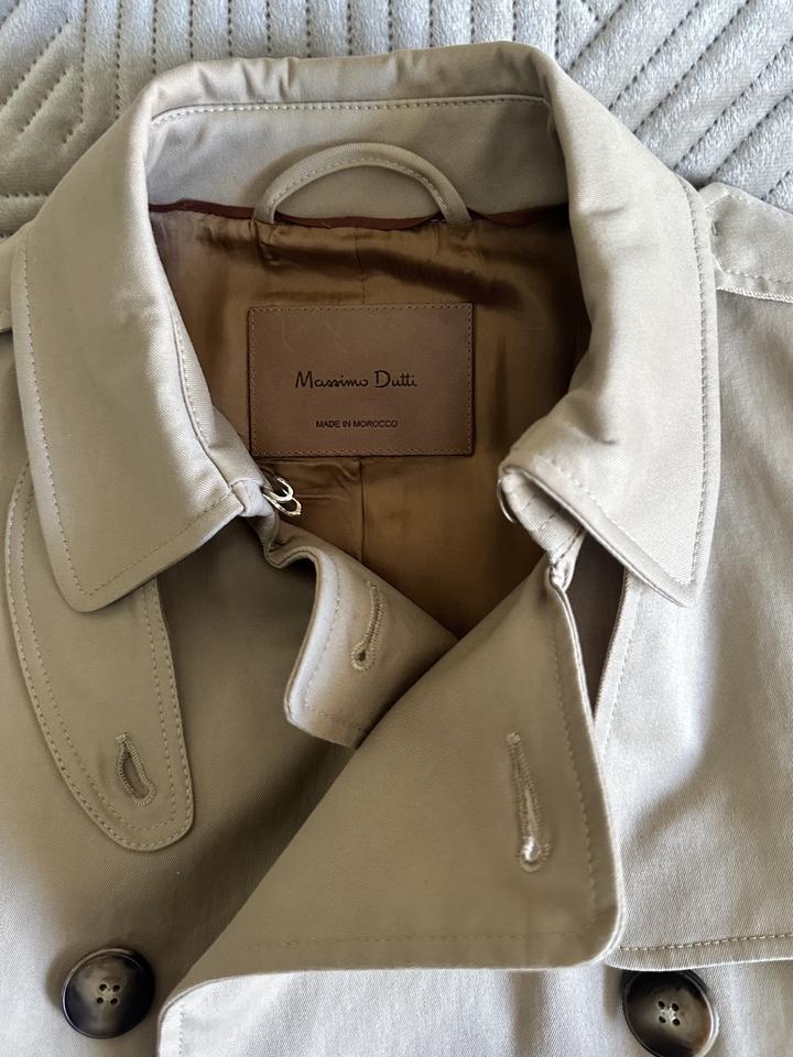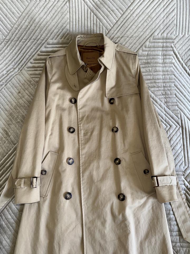Тренч Massimo Dutti, размер XS Цвет: бежевый (немного с оливковым подтоном) Состав: 97% хлопок, 3% эластан подклад: 100% вискоза В отличном состоянии, длина примерно по колено, не оверсайз. Хлястики на плечах. Двубортная застежка на пуговицы спереди. Два боковых кармана. Ремень с пряжкой. Шлица сзади. Разрез снизу сзади. Артикул: 162674