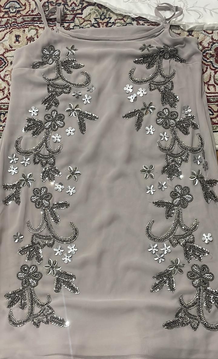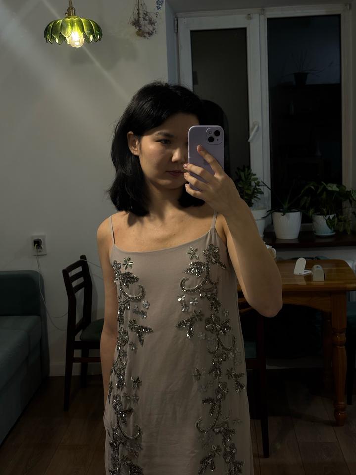 платье очень нарядное и удобное, мой рост 165 на мне выглядит как мини, цвет очень красивый дымчато-лавандовый идеально сочетается с серебристым бисером , с этим платьем даже без украшений образ смотрится полным. состояние отличное Артикул: 169691