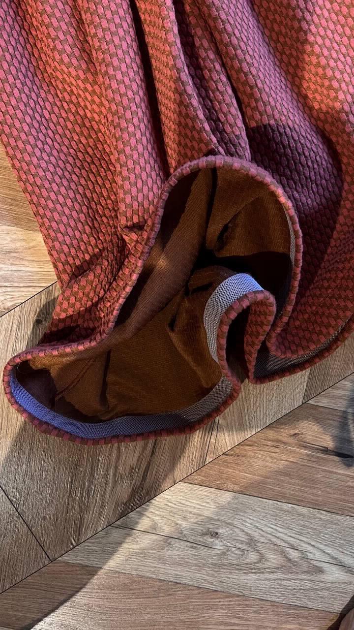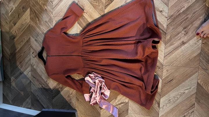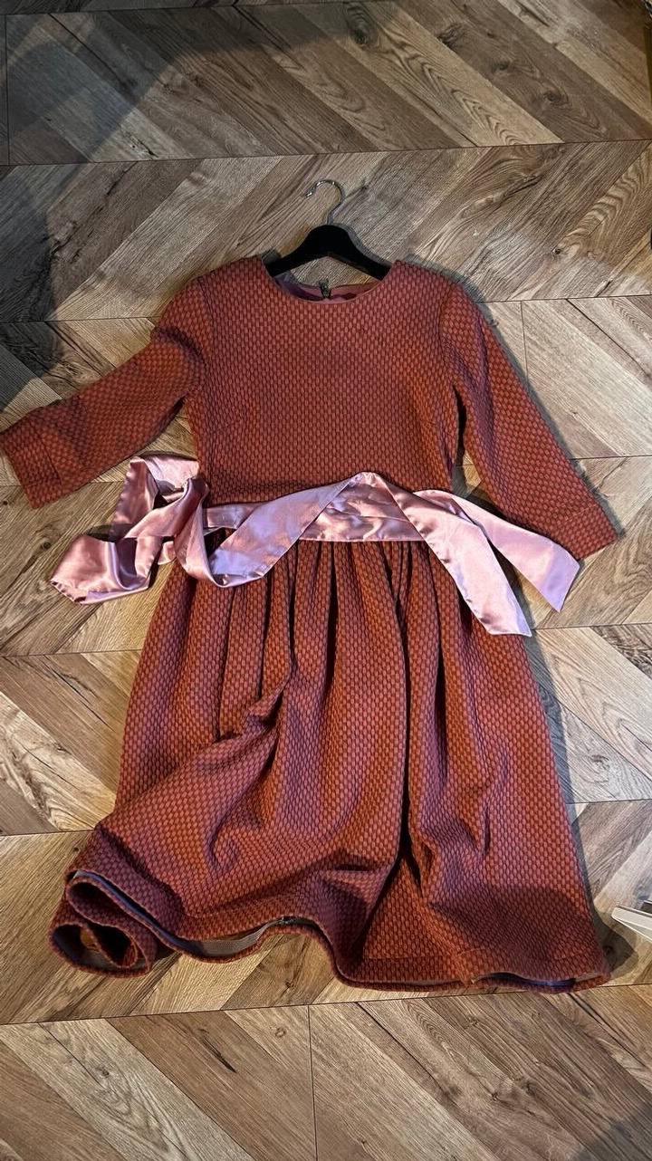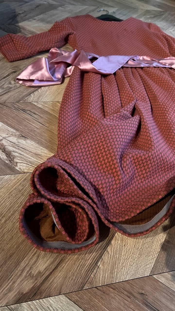 Платье терракотовое Пошив идеальный, фасон и форма супер. Ткань очень качественная и приятная. Корейское. Очень классное. снизу женская лента для красивого края юбки. Атласная лента в комплекте. Артикул: 177677