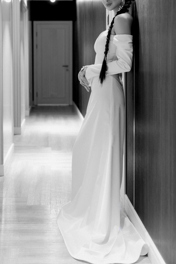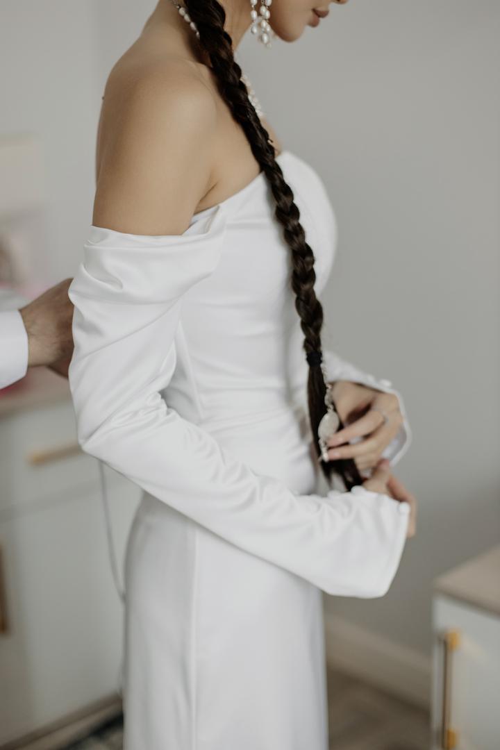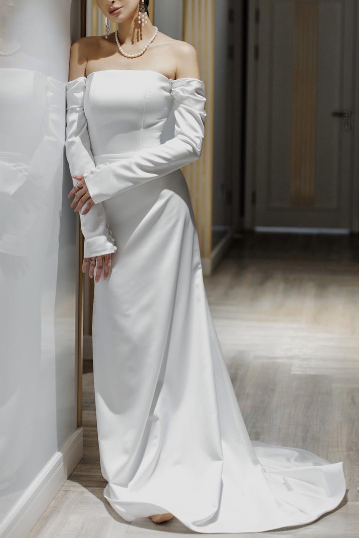 Продаю очень красивое свадебное платье. Сшито на заказ за 150.000тг. Небольшой шлейф комфортной длины, удлиненные рукава на обшитых пуговицах, очень приятная ткань, сзади завязывается на шнуровке. Продаю за 80.000 (т.к. нет одной пуговицы на рукаве). В остальном платье в отличном состоянии, после хим чистки! Мой размер S, рост 170 Артикул: 177560