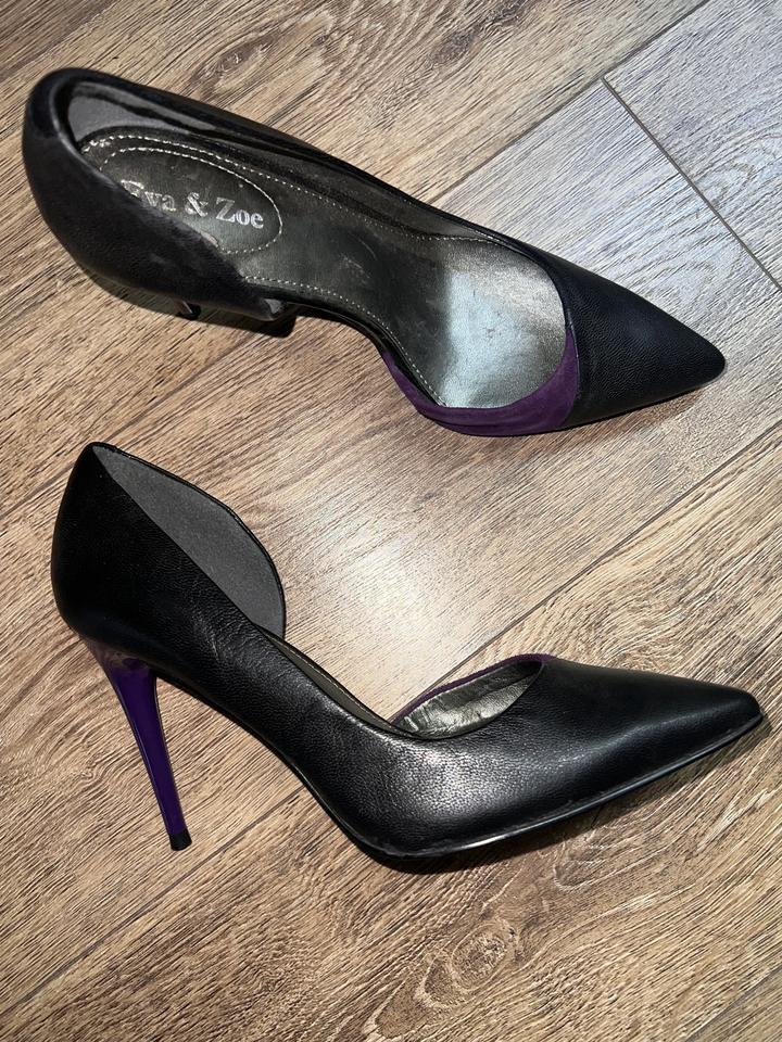 новые, не ношенные. есть нюанс на фото каблук 10 см размер Американский 7- примерно 37 снг черные с фиолетовыми вставками под замшу Артикул: 204304