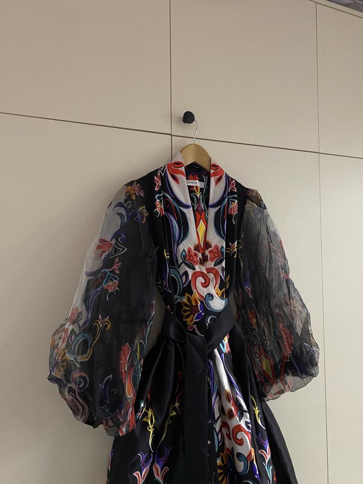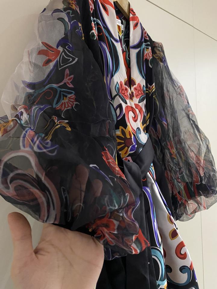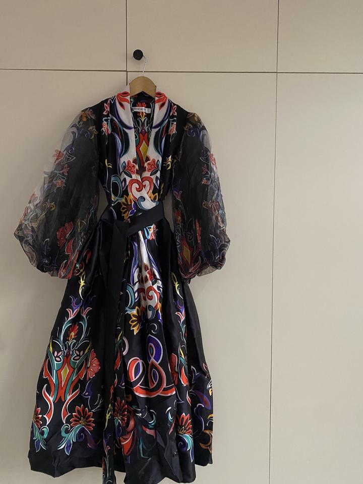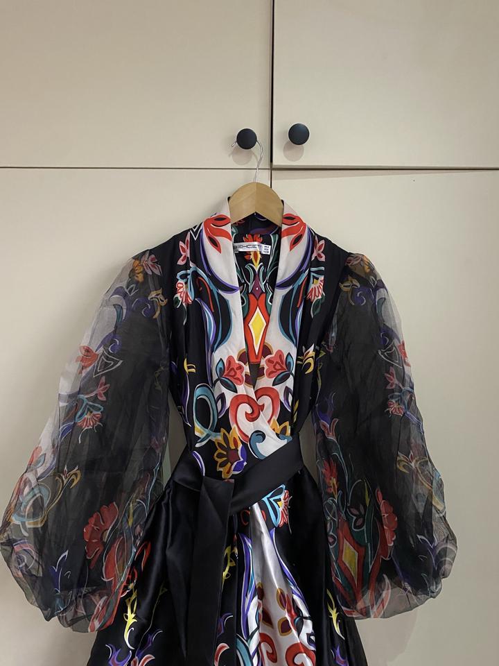очень красивое вечерное платье с интересным принтом. носила только 1 раз. имеются кармашки с двух сторон. очень хорошо держить форму и красиво подчеркивает фигуру. Артикул: 211453