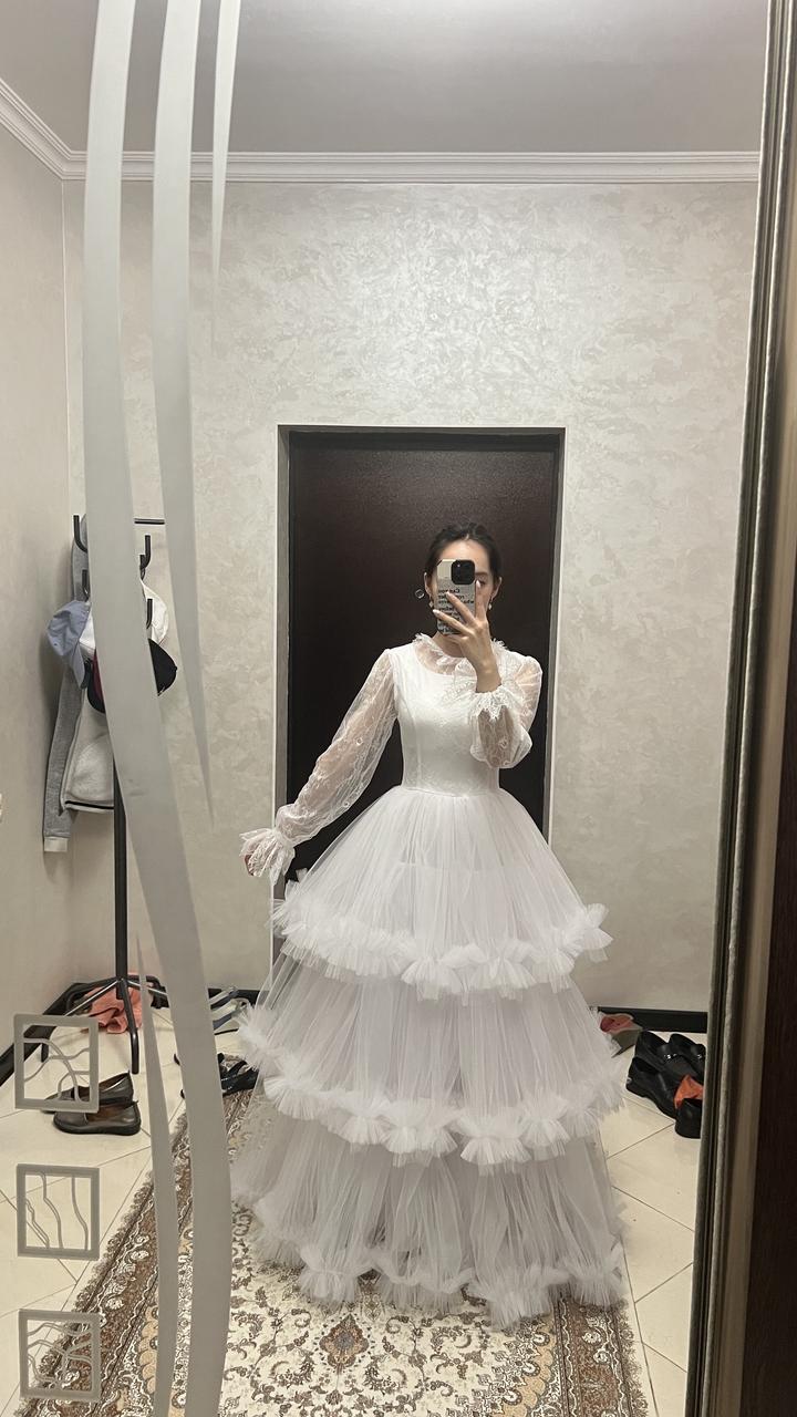 Платье, выполненное на заказ, идеально подойдет на размер XS-M благодаря регулируемому корсету сзади. Одевалось всего один раз, абсолютно как новое — без пятен и повреждений. Рукава из тонкого кружева придают образу нежность и легкость. Платье можно носить и без кольца, что делает его удобным и универсальным для различных образов. Артикул: 213108