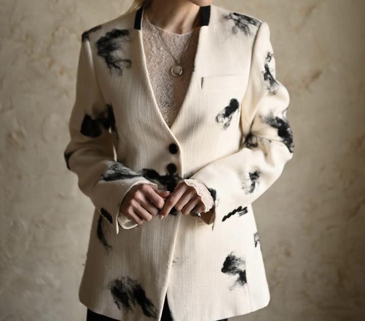 Пиджак молочного цвета с подкладом, интересно оформленный ворот, вбитая вяленая шерсть, размер xs-s, новый с биркой, брали в Гуанчжоу Артикул: 224566