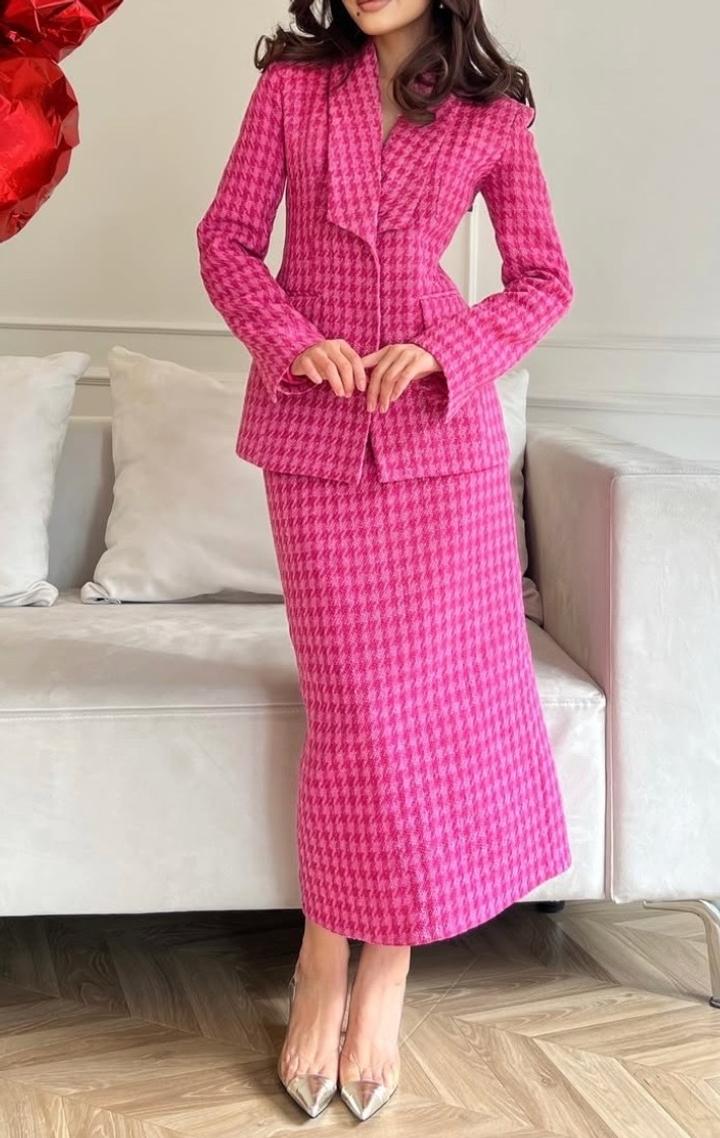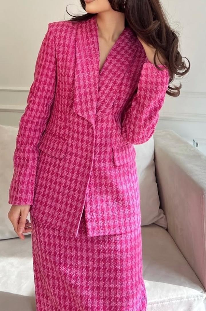 Двойка пиджак с акцентом на талии и юбка с вырезом на макси длины визуально удлиняет ростS