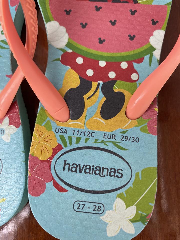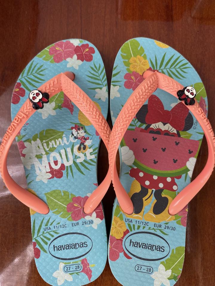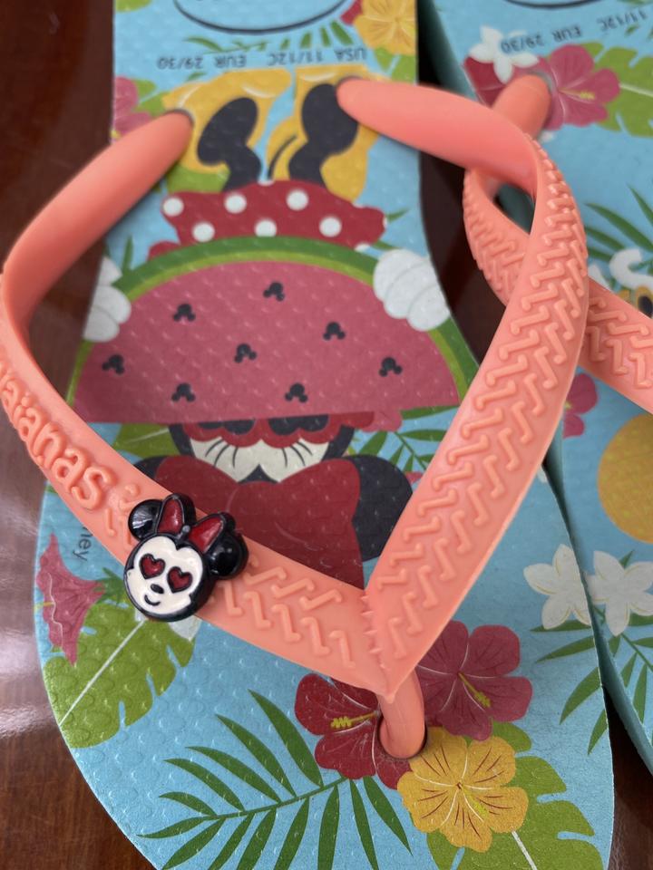 Оригинальные шлёпанцы из Бразилии для детей которые любят Дисней. Подошва украшена принтами Минни Маус. Также на ремешке есть металический брелок в форме Минни. Удобные, прочные, лёгкие, термостойкие, не скользящие и водостойкие. Размер 27-28 ( 4-4,5 лет). Артикул: 232671