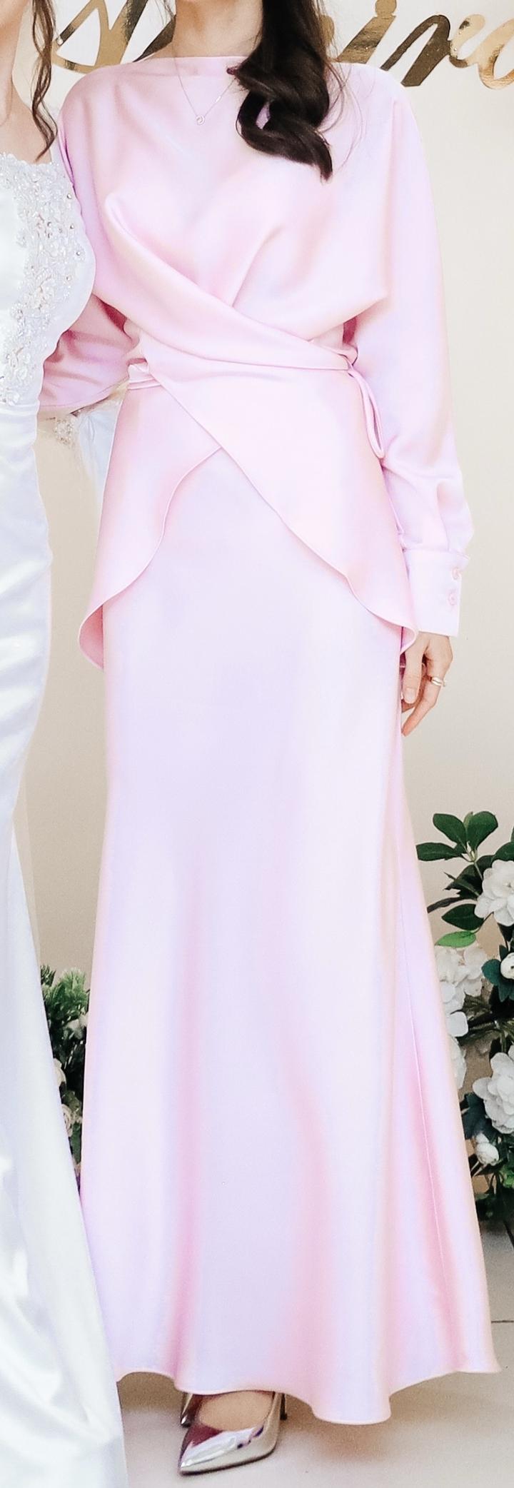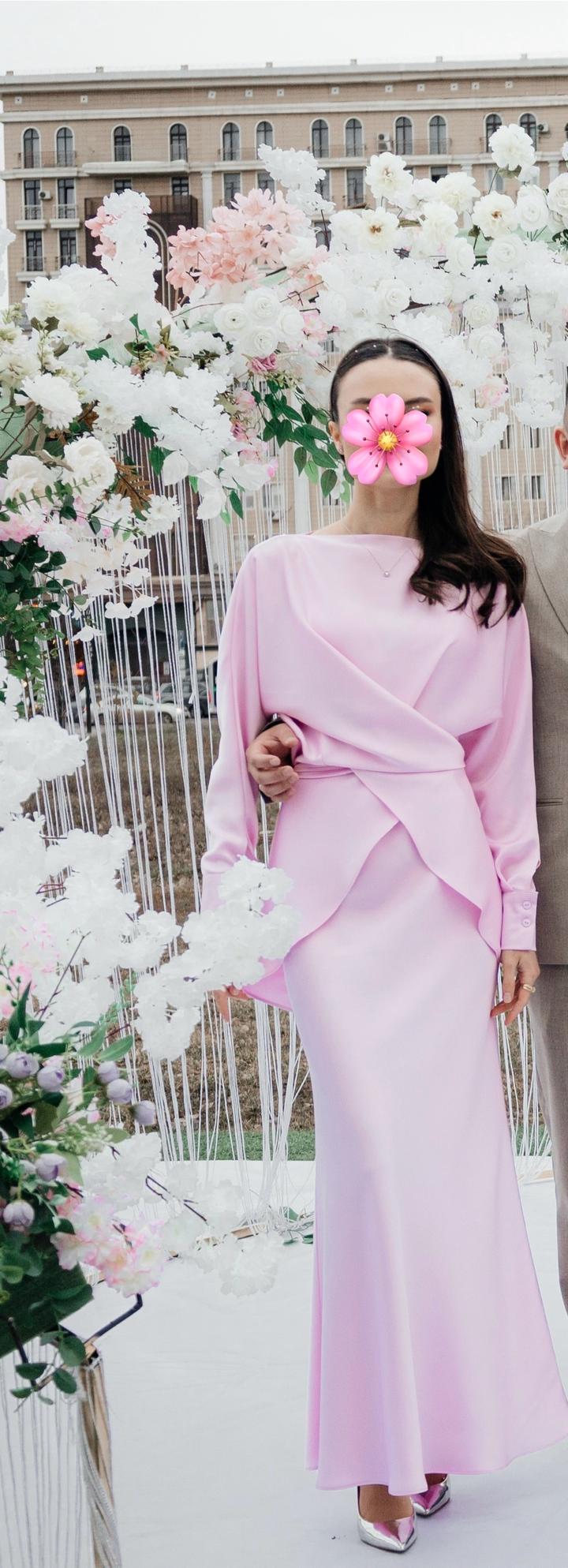 Нежно-розовый комплект, состоящий из необычной блузы с юбкой. Материал прекрасного качества, струится и очень приятен к телу. Надевала 1 раз в качестве наряда подружки невесты. В идеальном состоянии, как новое. Артикул: 237460