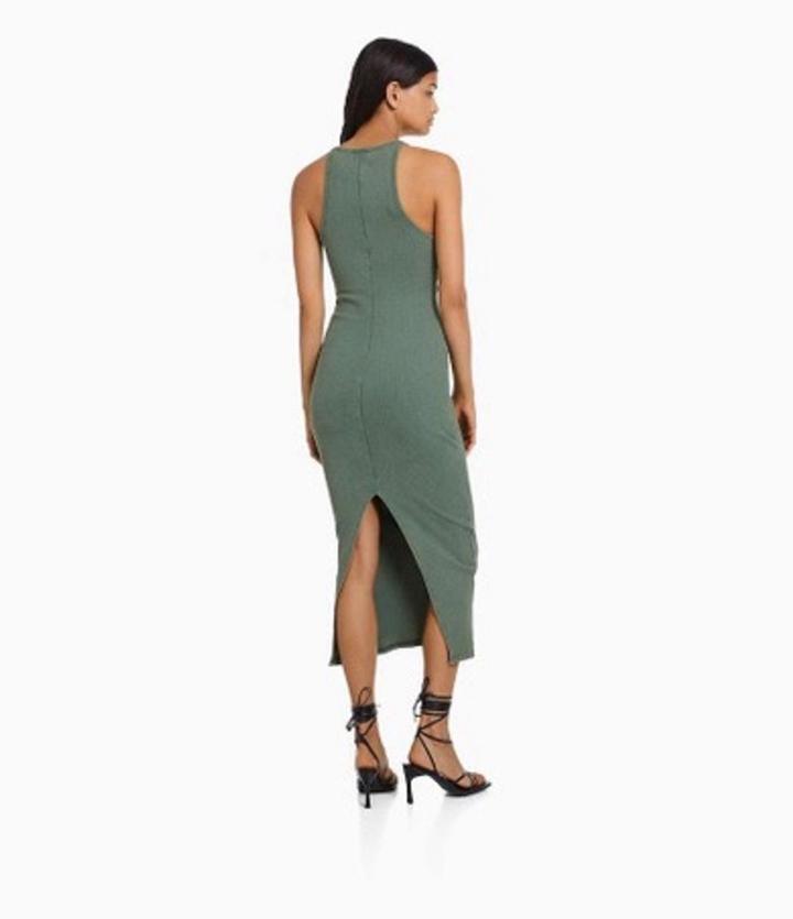 Трикотажное платье миди в рубчик Облегающее платье из мягкого трикотажа в мелкий рубчик. Идеальная посадка по фигуре, длина миди, удобный разрез сзади для свободы движений. Цвет: приглушённый зелёный (очень благородный, универсальный). Подойдёт для повседневных образов, прогулок, свиданий или даже офиса в неформальном стиле. Артикул: 238477