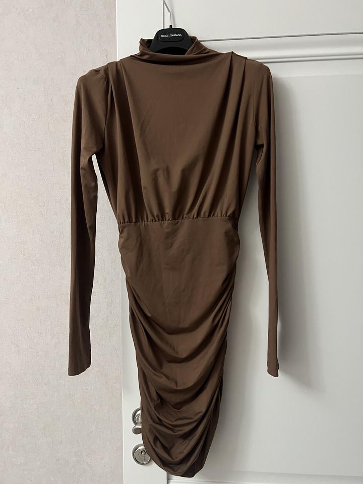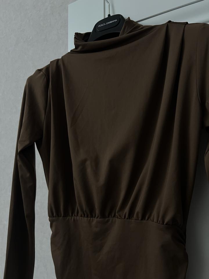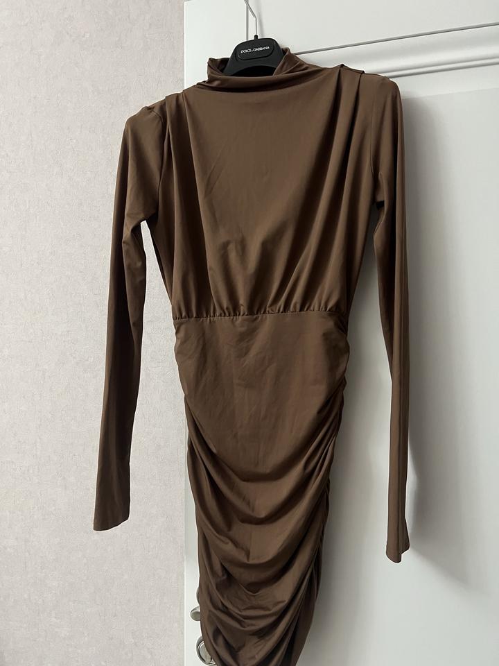 Платье коричневое по талии Мягкая тянущаяся ткань Длинный рукав, до колена Артикул: 240583