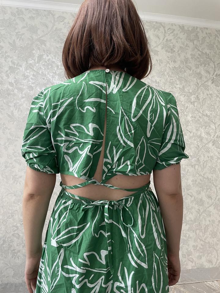 Зелёное платье с оригинальной спинкой и лиственным принтомM