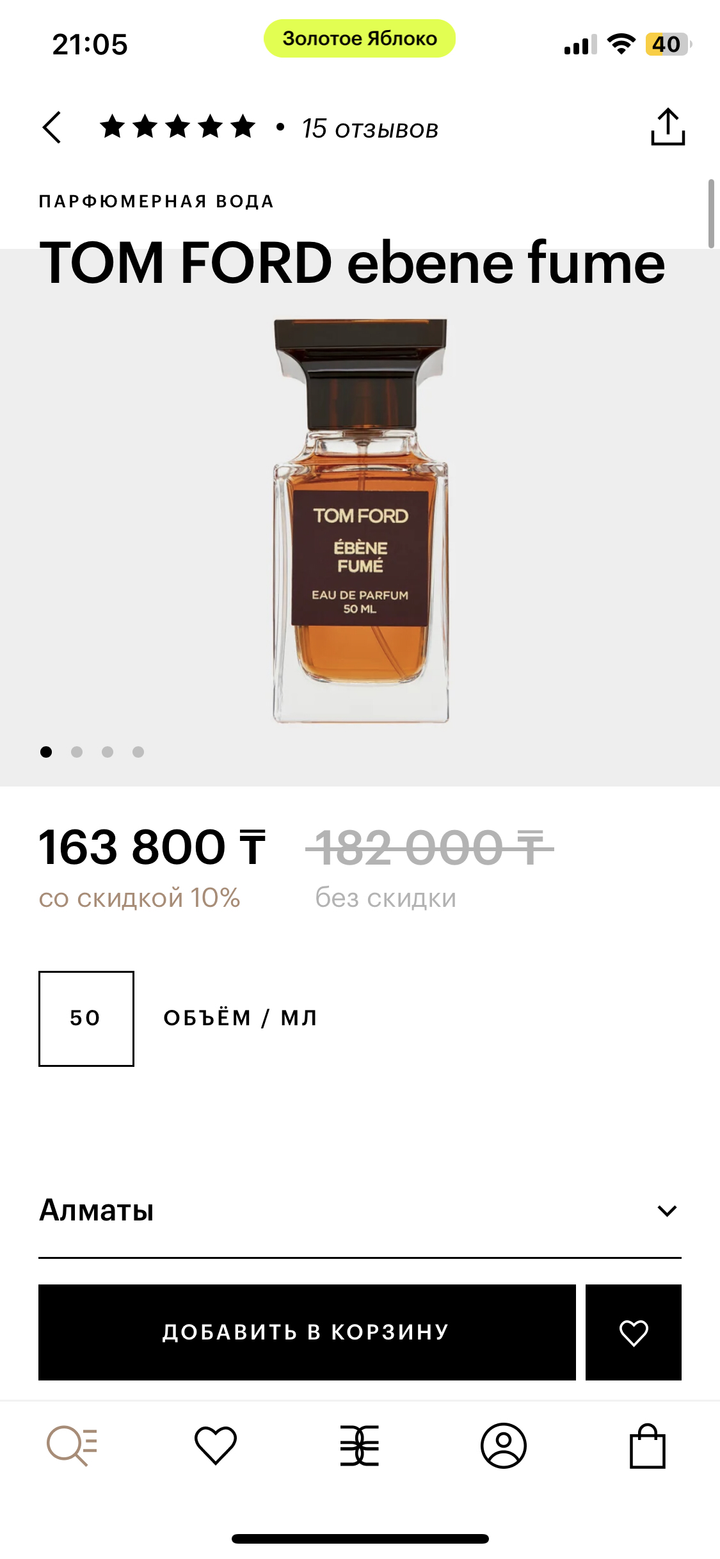 Tom Ford Ébène Fumé, 50 мл – оригинал из Duty Free (Стамбул) Продам новый мужской парфюм Tom Ford Ébène Fumé. Оригинал, привезён из дьюти-фри Стамбула. Флакон не распакован, объем 50 мл. Причина продажи — купили два одинаковых, второй оказался лишним. Цена в “Золотом яблоке” указана на фото (дороже) Артикул: 247967