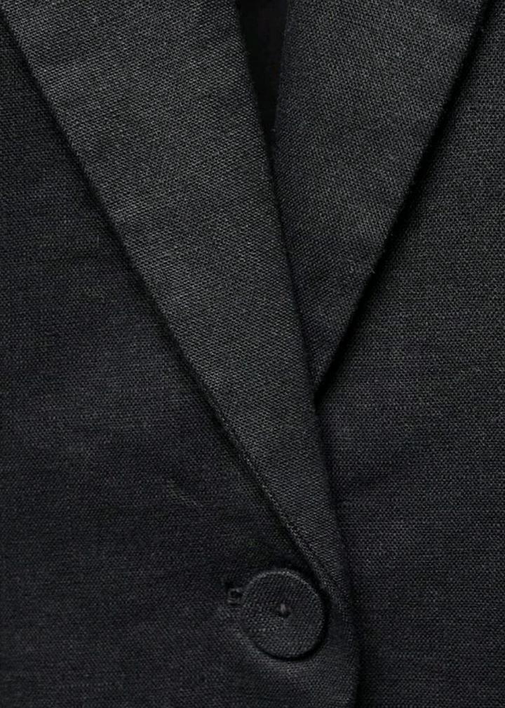 Пиджак прямого кроя. Ткань из 100% льна. Абсолютно новый с этикеткой. V-образный вырез горловины с лацканами. Длинные рукава с манжетами на пуговицах. Спереди два прорезных кармана. Задний разрез внизу. Застежка на пуговицы спереди. Внутренняя подкладка.Размер европейский 38. Цвет чёрный. Артикул: 248032