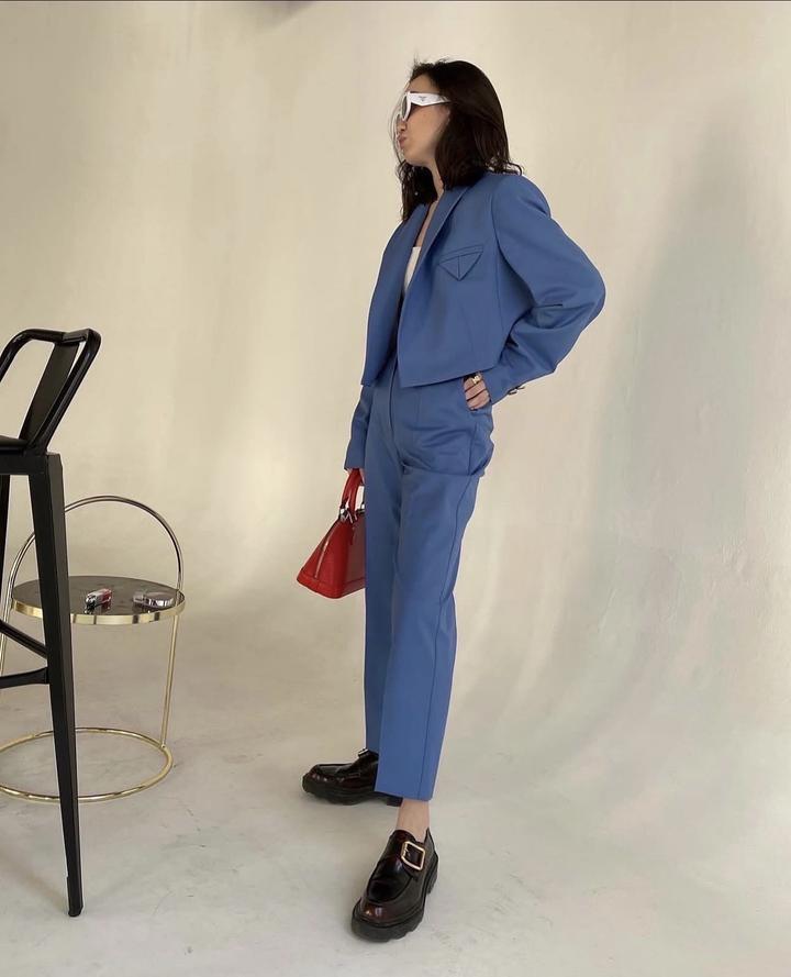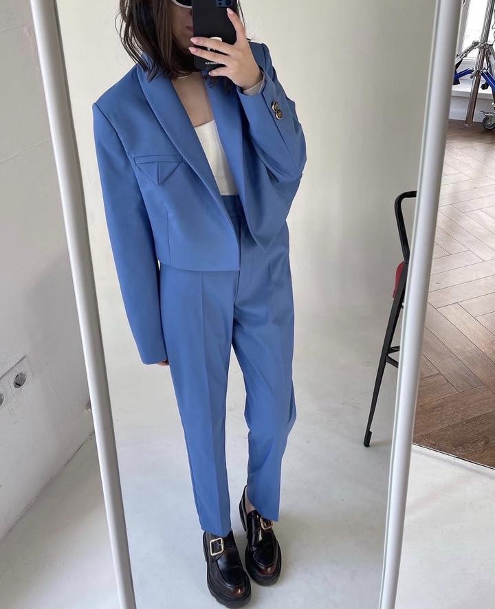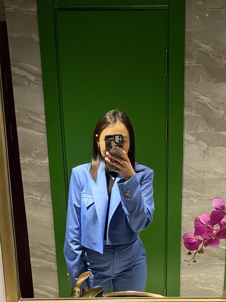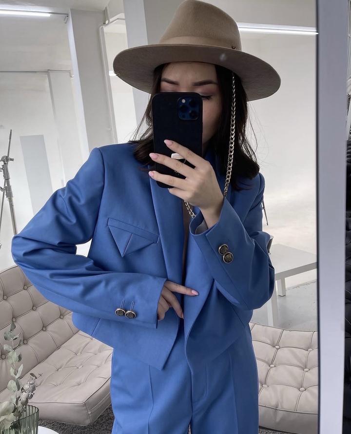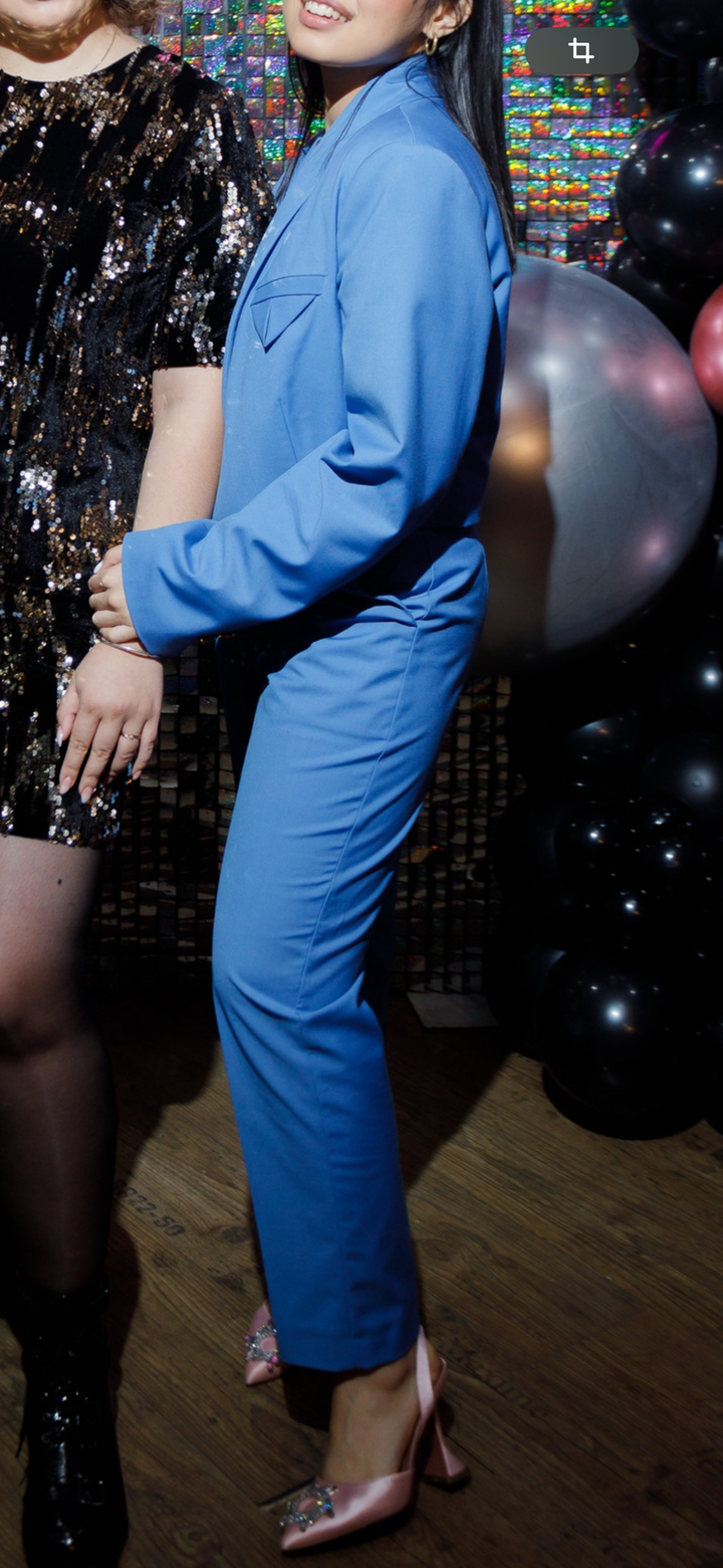 Дизайнерский костюм синего цвета от Courage couture (алматинский бренд), размер S-M (42-44), пиджак укороченный на атласном плотном подкладе, брюки со стрелками на высокой посадке, идеально подчеркивает талию и попу Артикул: 248470