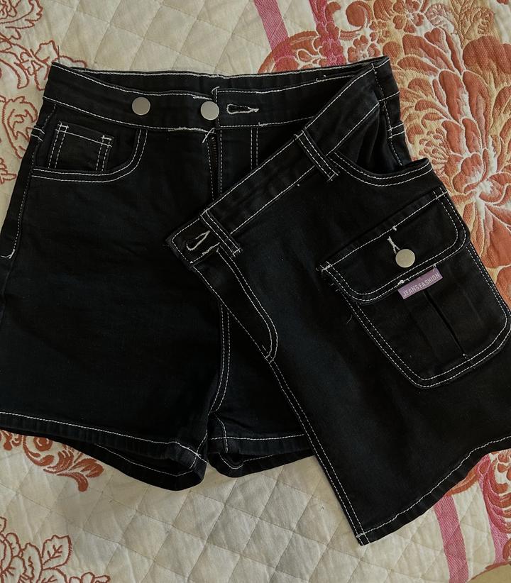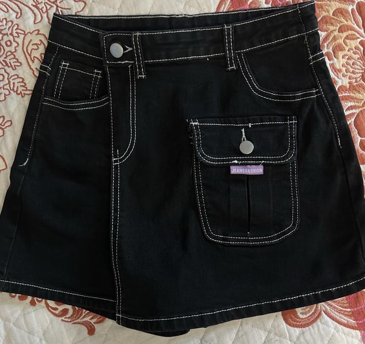 Это чёрная джинсовая мини-юбка-шорты. Внешне она выглядит как юбка, но, скорее всего, это шорты с накладной передней частью, создающей эффект юбки Артикул: 250886