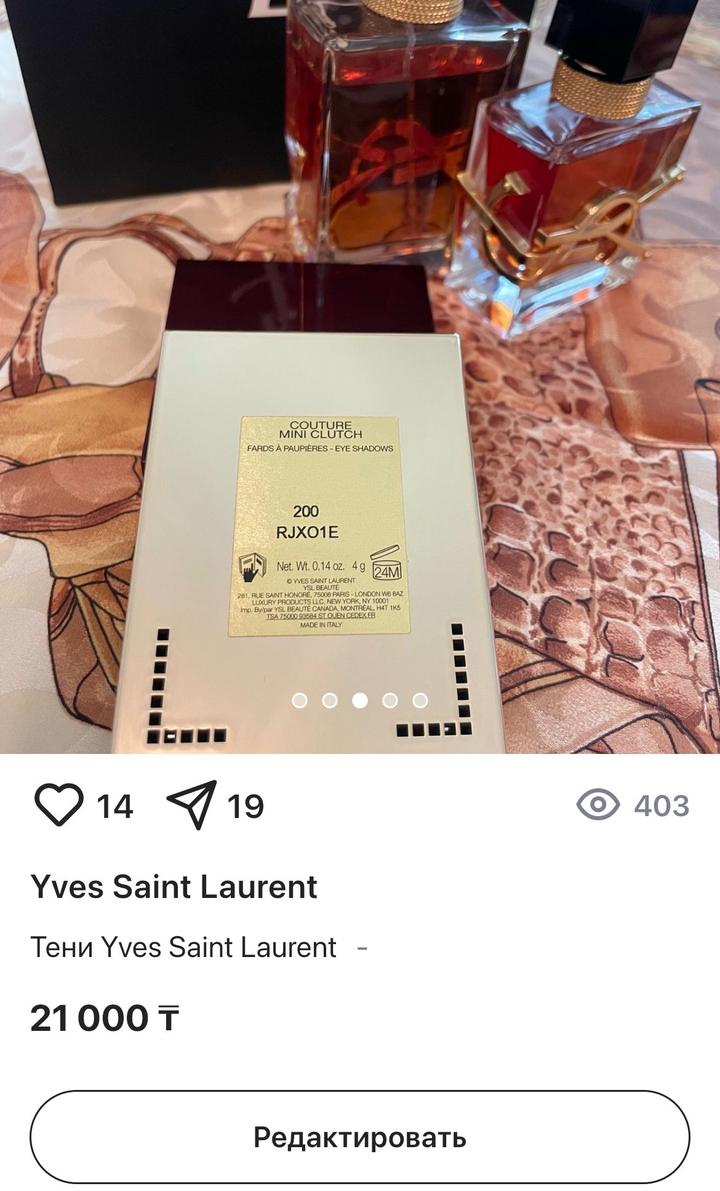 YSL 30ml: стойкий шикарный аромат со вкусным шлейфом 💫 экономный в использовании - 25.000 Chloe 30ml - 25.000 остаток на фото. Valentino 30ml -29.000 Byredo 30ml - 15.000 остаток. Тени YSL - 18.000 По моему промокоду будет еще 2000тг скидка, смотрите другие объявления, на несколько позиций сделаю скидку. Артикул: 264993
