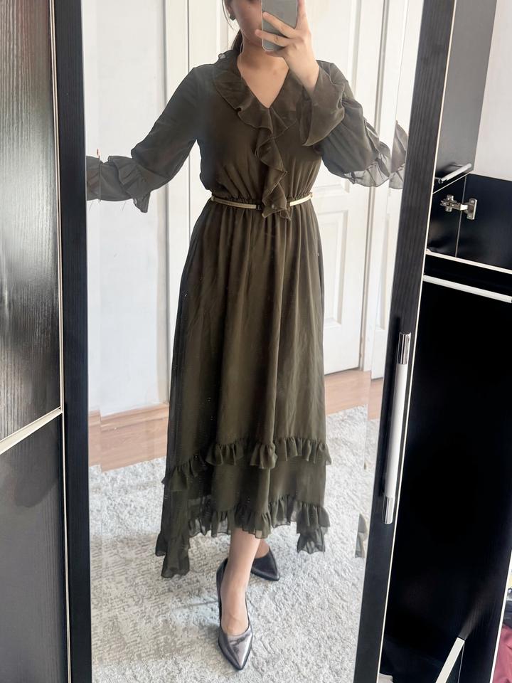 Лёгкое платье макси в благородном оттенке хаки. Летящая ткань, изящные рюши и удобная резинка на талии подчёркивают фигуру. Можно носить и на каждый день, и на вечер. Состояние отличное, носилось аккуратно. Артикул: 267301