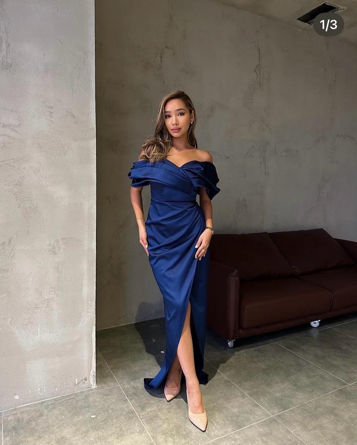 Шикарная синее платье, плечи приспущены, вырез на ножки, мягкий корсет имеет свои чашки. Артикул: 269027