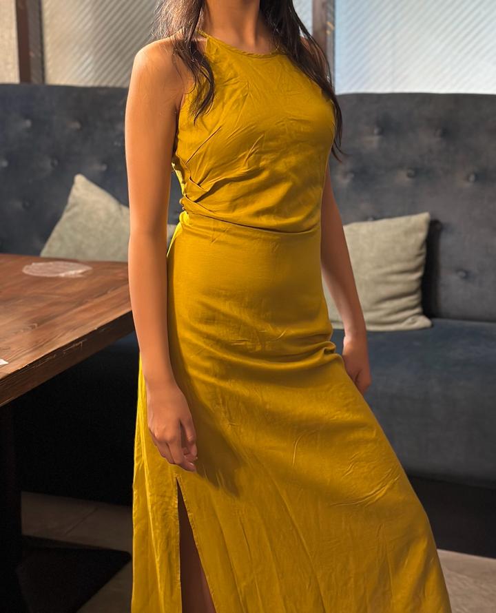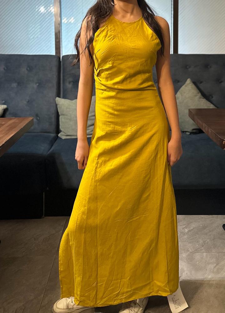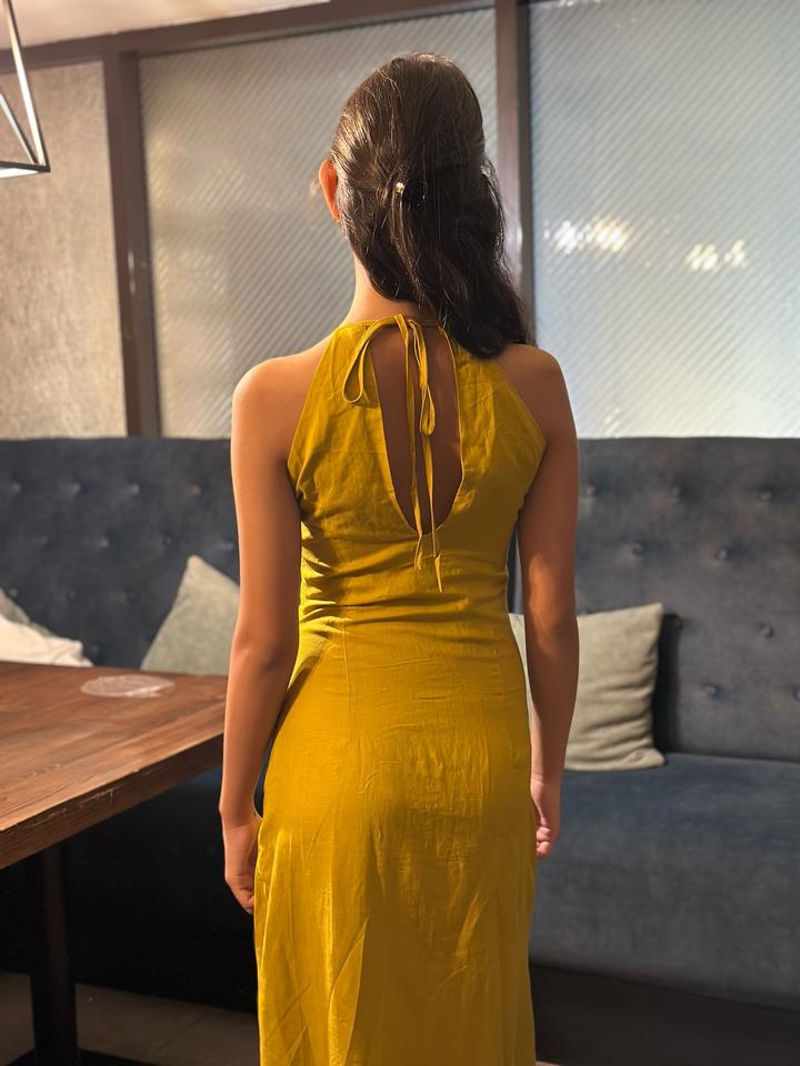 Платье макси из льна высокого качества. Приталенный крой, акцент на талии, боковой разрез. Открытая спина с завязками. Цвет: горчица, черный Размеры: S, M, L. Артикул: 271778