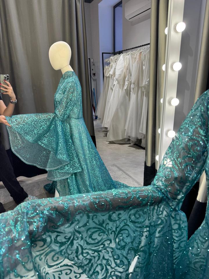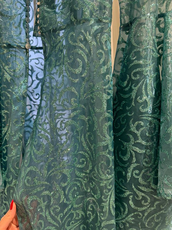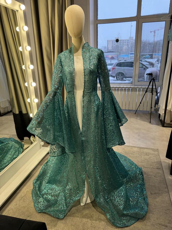 Свадебный камзол изумрудного цвета со шлейфом. Идеально подойдет для Узату или на фото съемку. Блестки немного сыпятся, но не сильно. Одевала на съемку один раз. Рост маникена на фото 168см. Обхват груди 93-94см. Рост модели на фото 175см Артикул: 276103