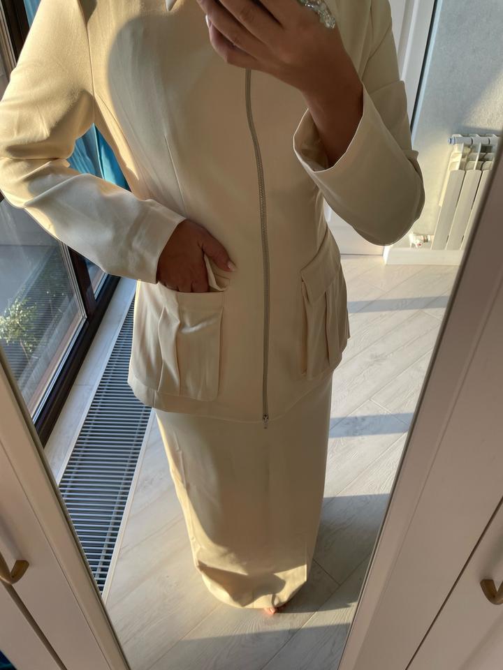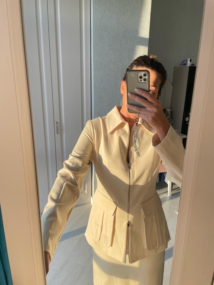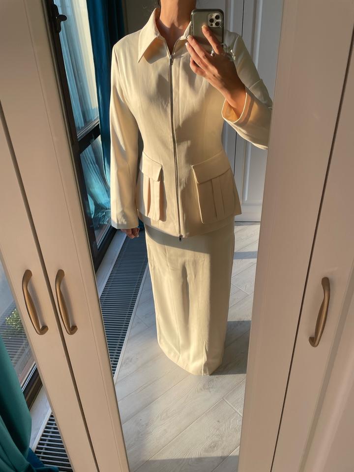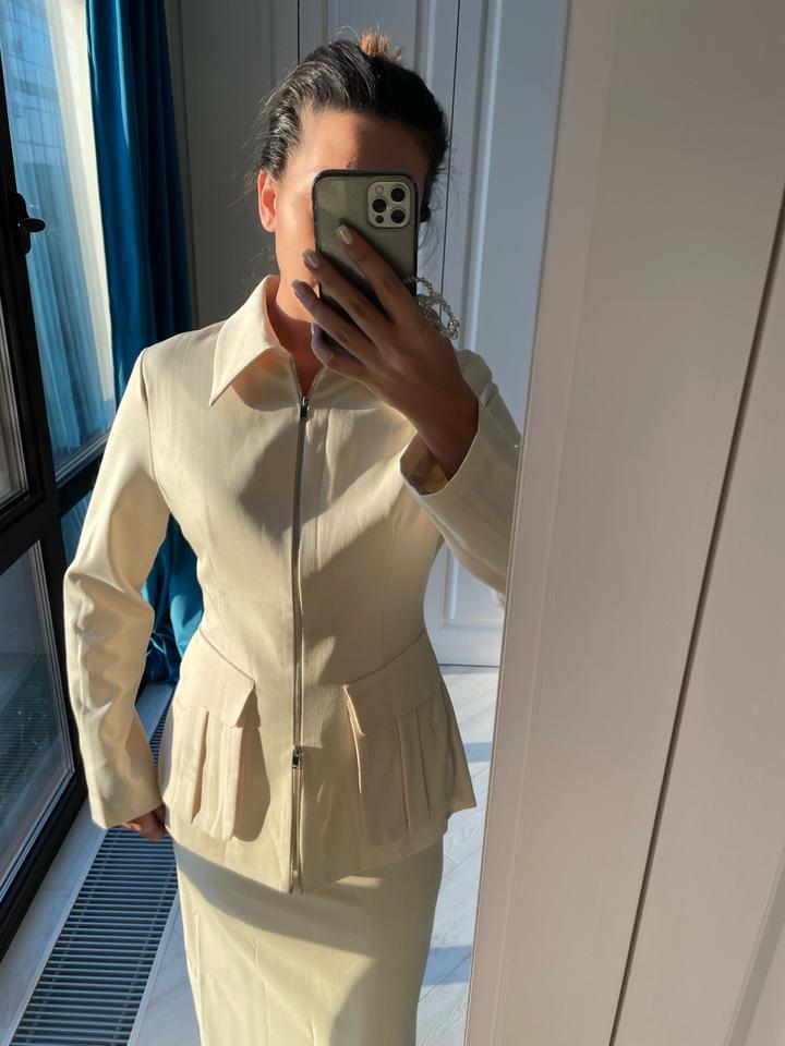 Костюм от weekend. Размер Л. На 46 идеально. Цвет сливочное масло. Замок на пиджаке работает и снизу и сверху. Ткань приятная к телу. Сзади на юбке есть разрез. Артикул: 281133