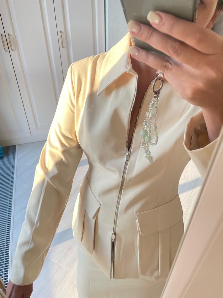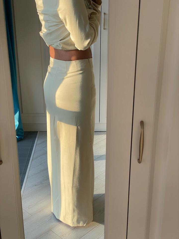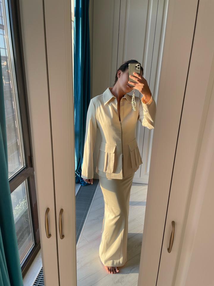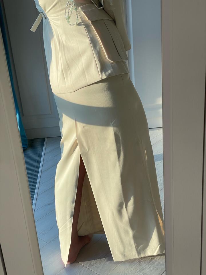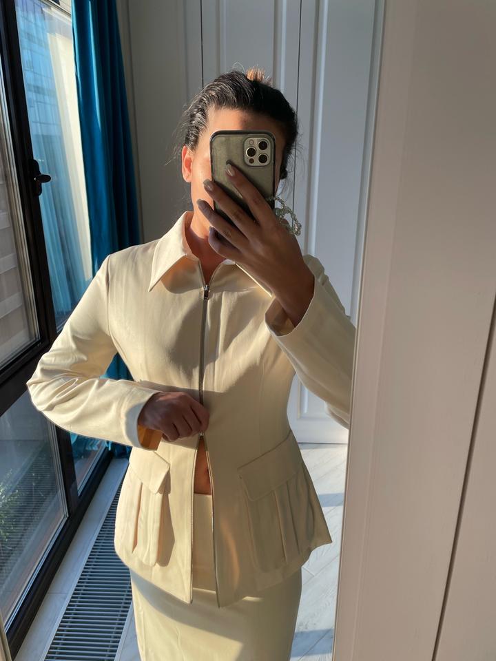 Костюм от weekend. Размер Л. На 46 идеально. Цвет сливочное масло. Замок на пиджаке работает и снизу и сверху. Ткань приятная к телу. Сзади на юбке есть разрез. Артикул: 281133