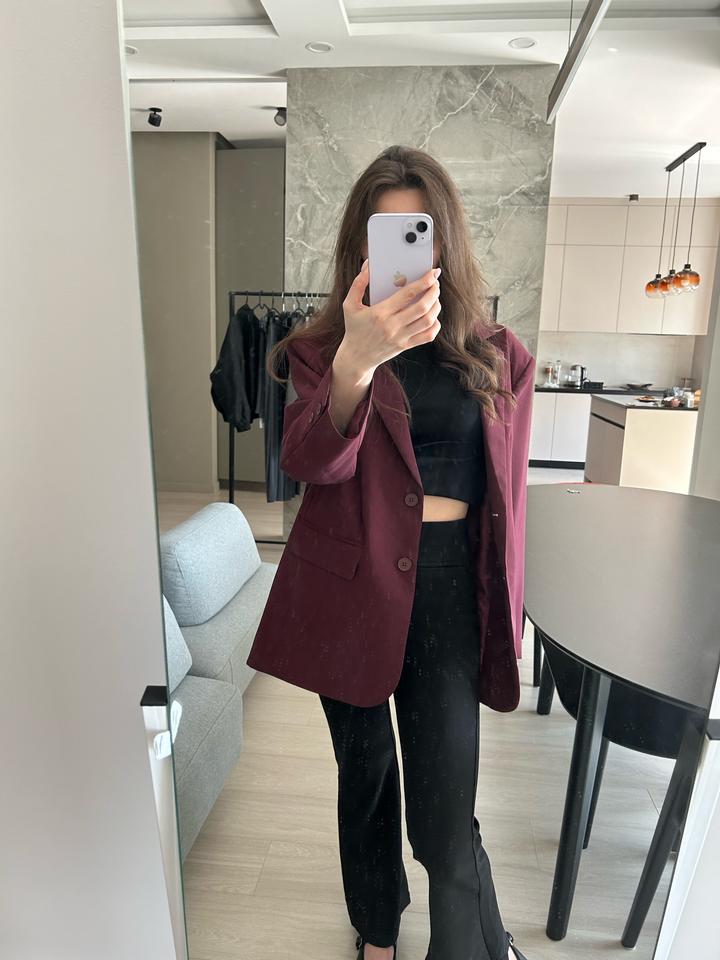 Цвет: глубокий бордо выглядит дорого и благородно Размер: oversize Состояние: новый Материал: костюмная ткань, хлопок Подходит для: офиса, встреч, мероприятий, стильных повседневных образов. Артикул: 284490