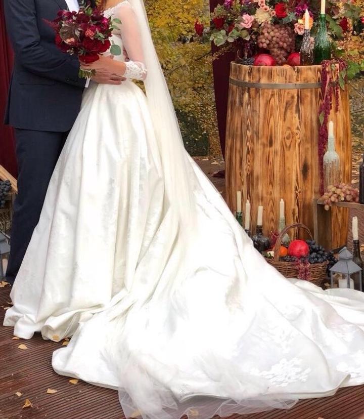 Продам свадебное платье на хрупкую и утонченную девушку. •Размер 38-42 (регулируется за счет шнуровки). •Ткань жаккард, цвет Айвори. •Имеется шлейф, который легко пристегивается на пуговицы. •В идеальном состоянии, надевалось всего один раз. •После профессиональной химчистки. •Платье было приобретено в салоне Ivory в г.Алматы. В фирменном чехле салона. В подарок обруч. Артикул: 289818