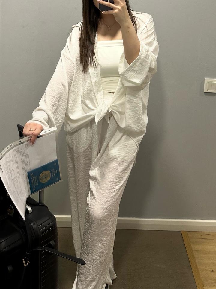 Комплект из шелка, рубашка и брюки свободного кроя в цвете айвори Артикул: 292305