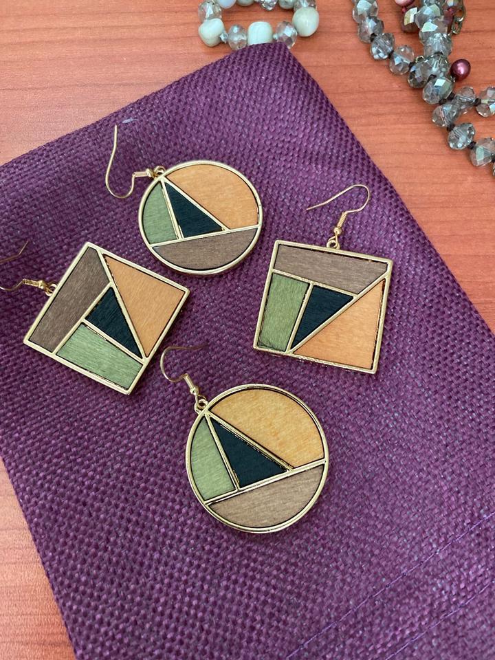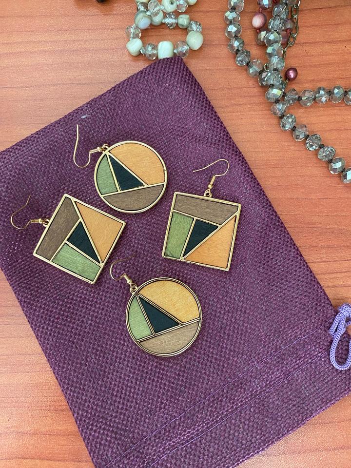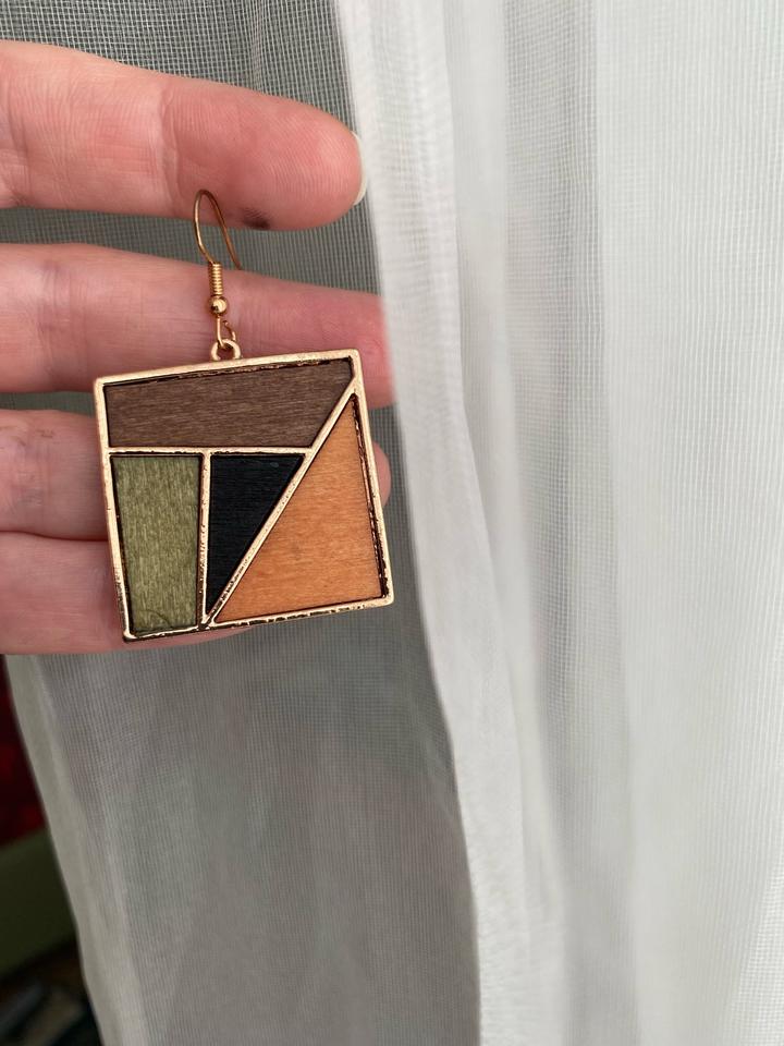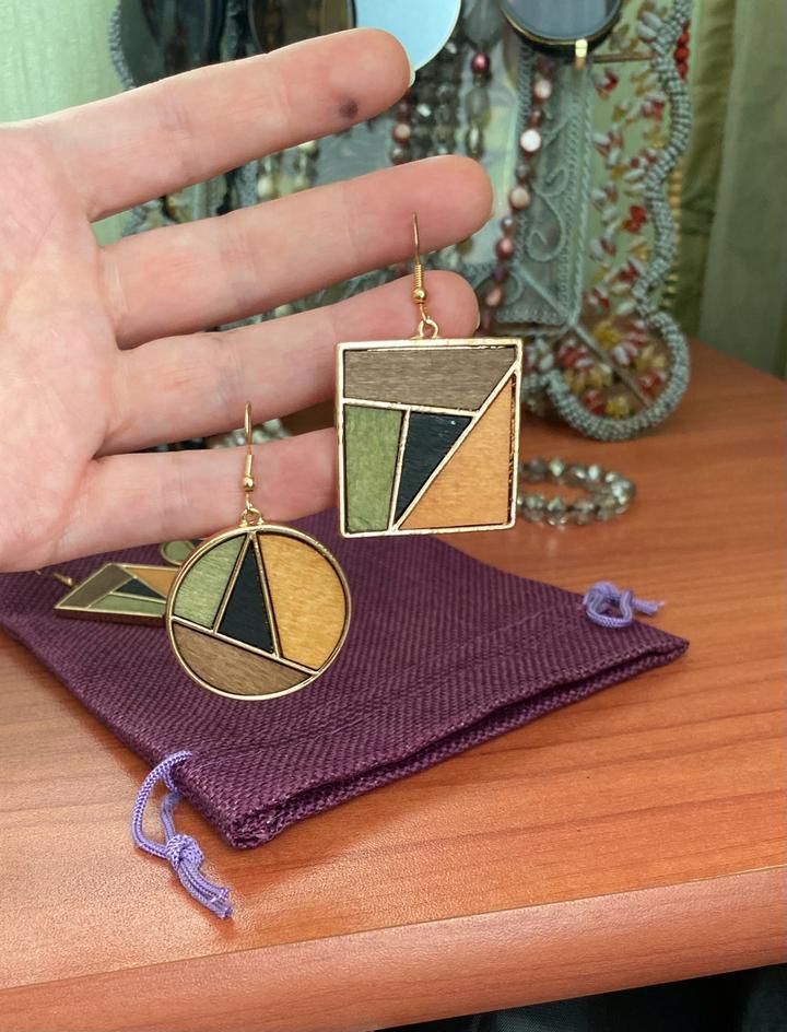 Новые серьги, циркониевый сплав и вставки из дерева. Остались квадратные. Имеют вес. Артикул: 292539