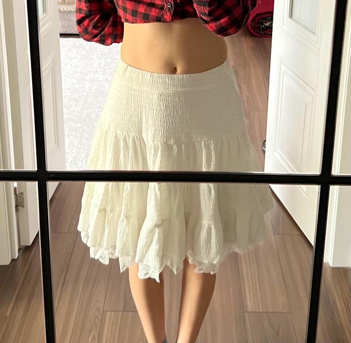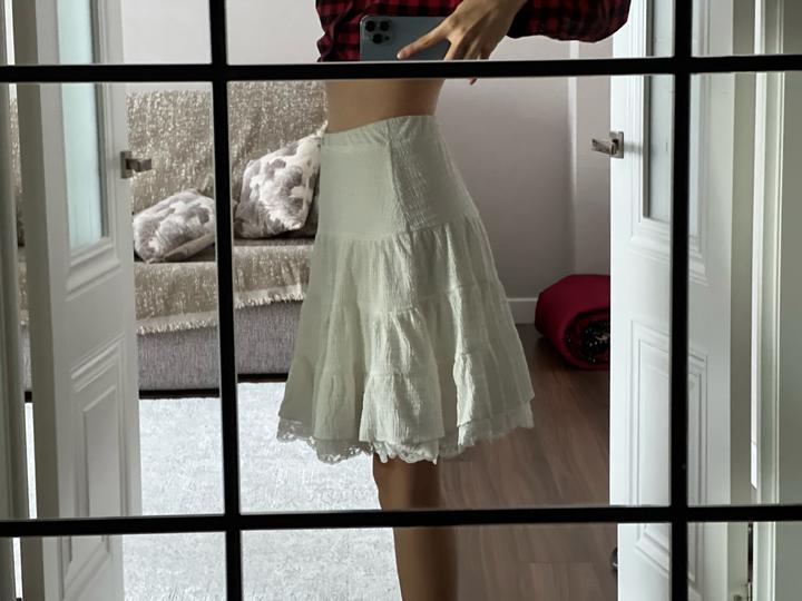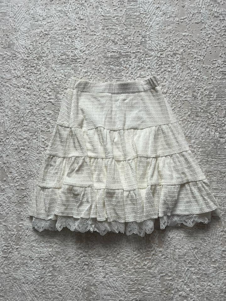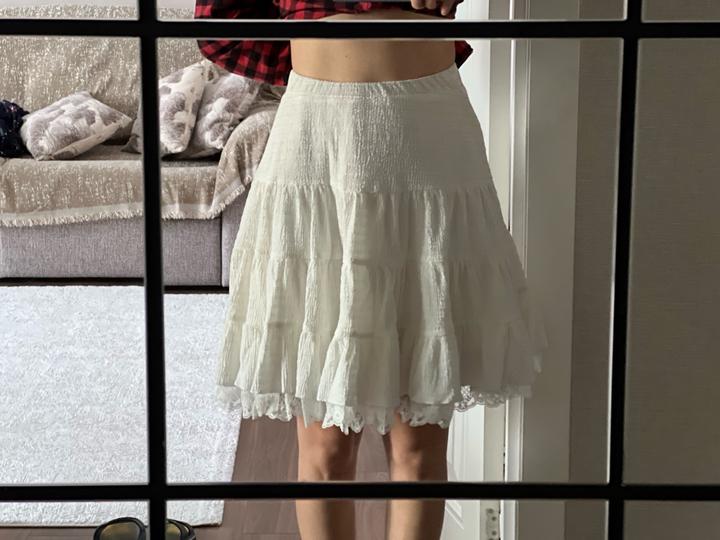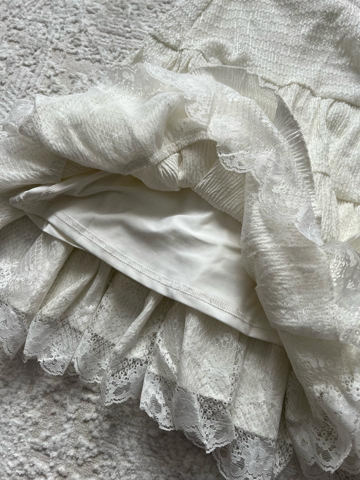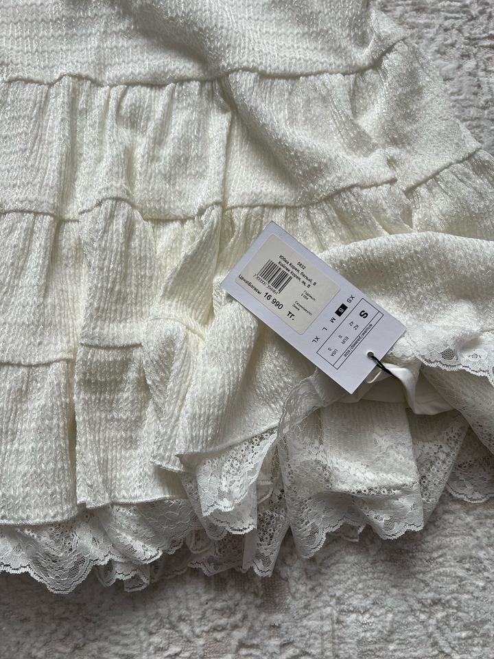 Пышная, белая юбка. Длина хоть и короткая, но приличная. Вельвет и кружева. Внизу есть подклад (не шорты). Новая, ни разу не надетая. Артикул: 294389