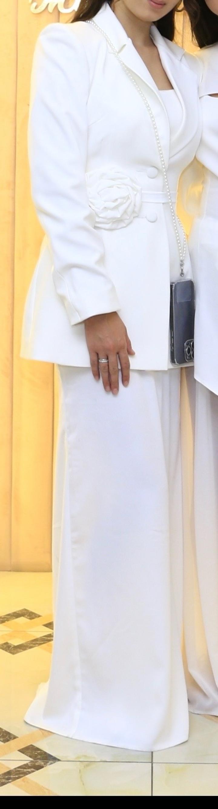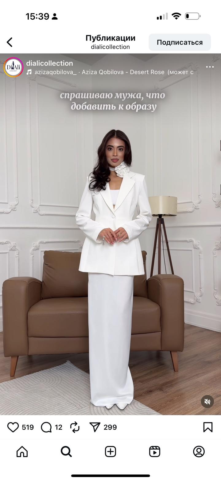 Белая двойка, костюм - из материала барби стрейч, юбка- из шелка. В комплекте идут также чокер и шелковый платок. Цвет белый. Носка была на свадьбу, 3-4 часа. Состояние идеальное. После химчистки Артикул: 294977