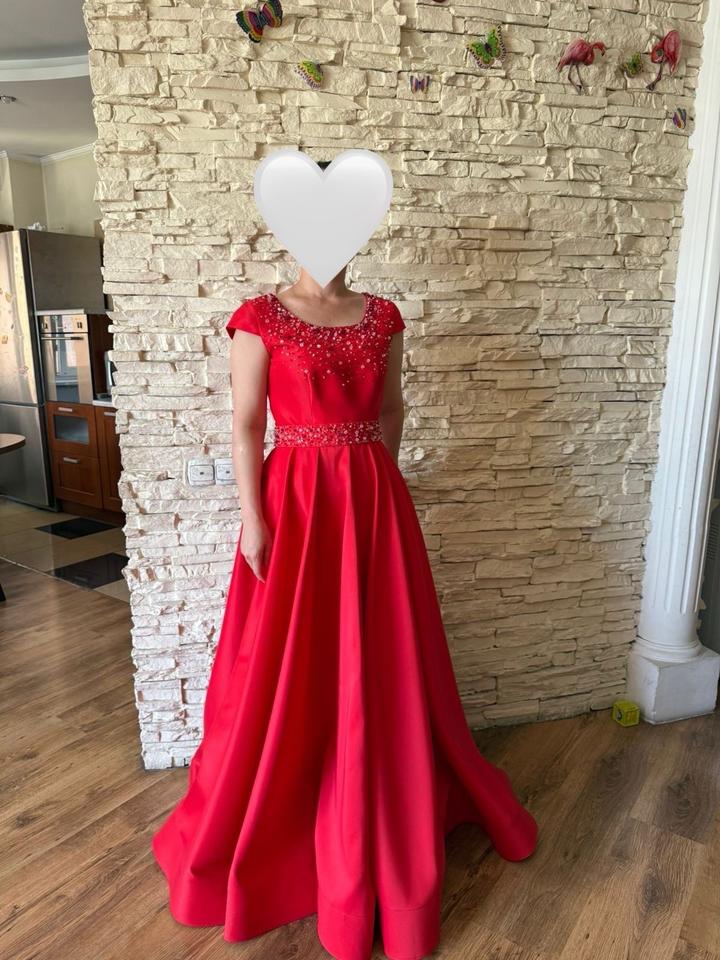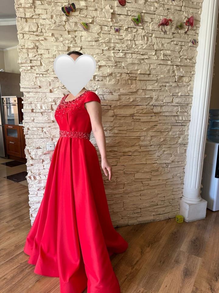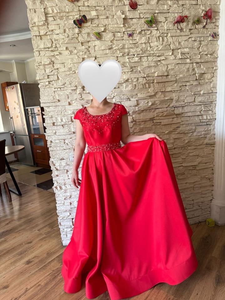 Красное вечернее платье, атласное , лиф и пояс обшит камнями, пояс съемный. Артикул: 299490