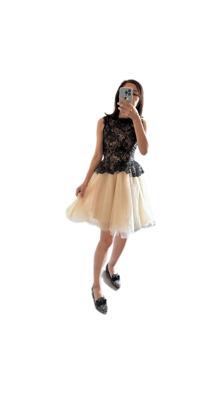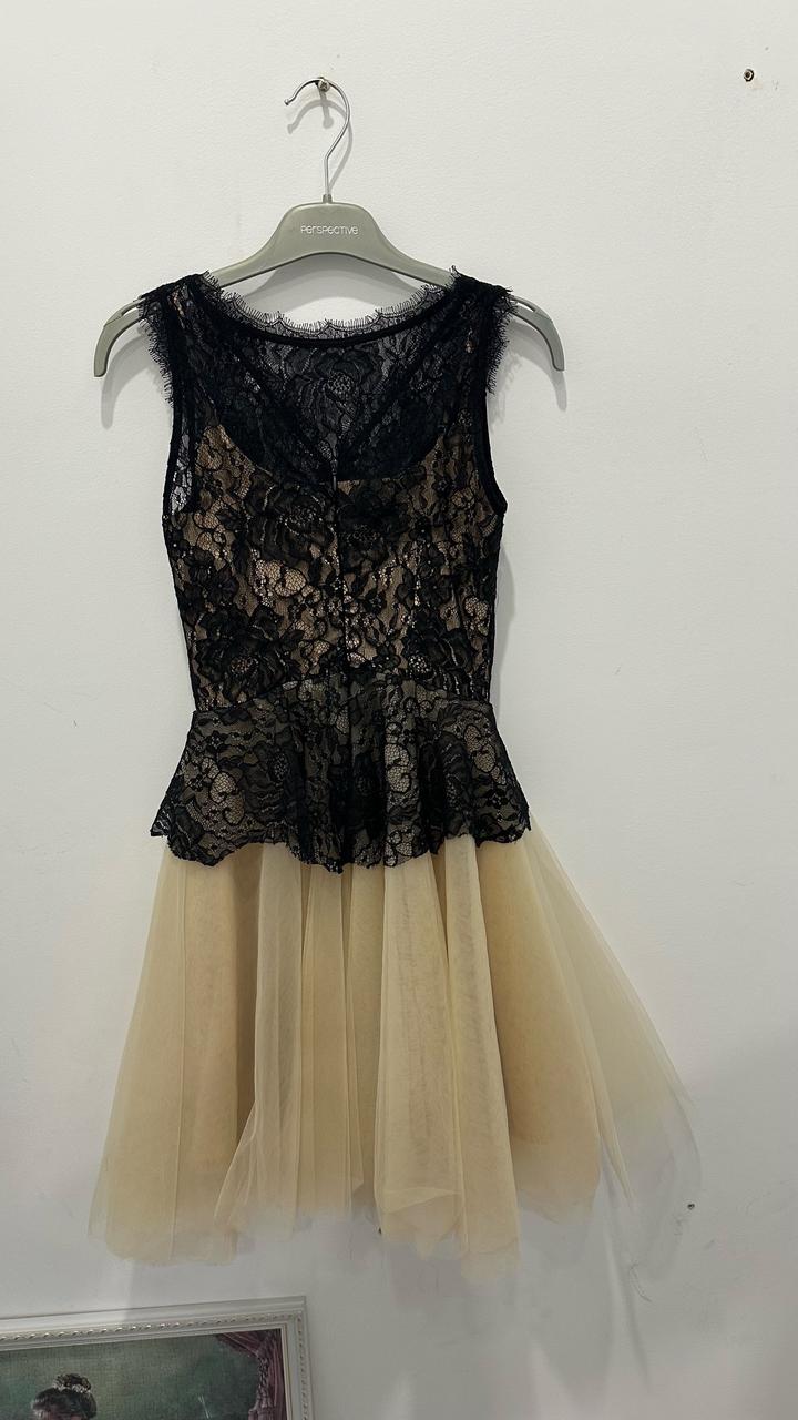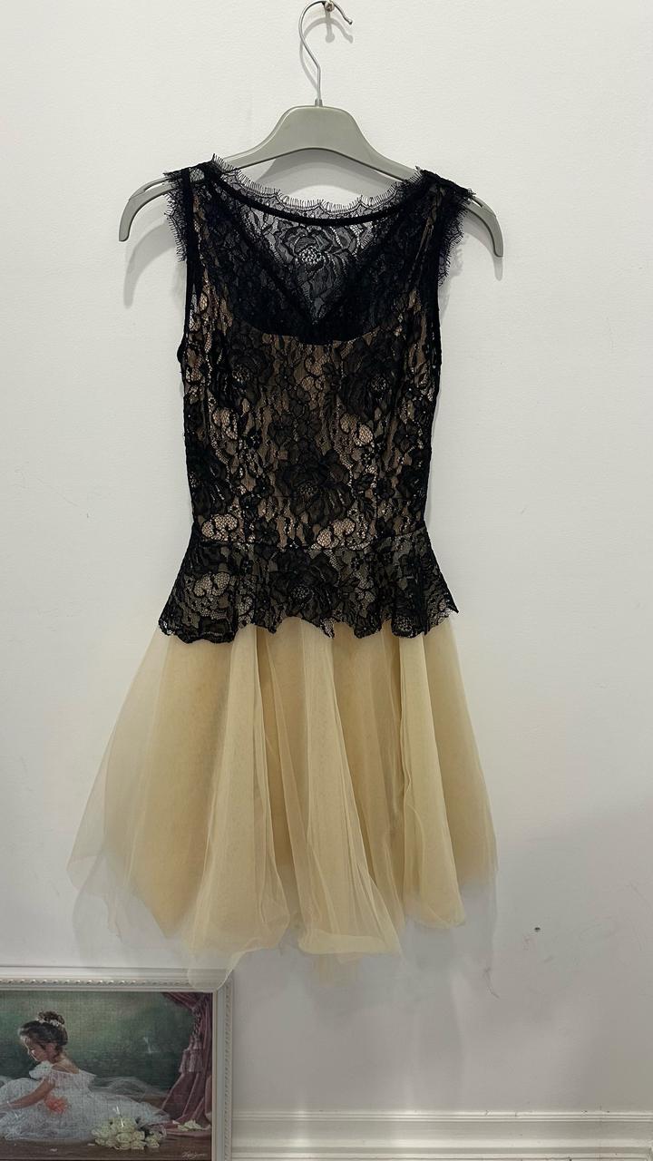 Верх из кружев черного цвета и юбка-пачка из сетки цвета Шампань беспроигрышный вариант на все времена. Платье в хорошем состоянии. На молнии. Мой рост 160 см, мне оно чуть выше колен. Турция, размер на платье 34. Артикул: 311051