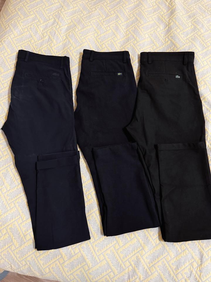 3 брюк Lacoste за 1 цену. Размер 40 eur. 1 летняя, 2 осень- зима. Состояние средне/хорошее. слева синие очень тонкие на лето отличный вариант, только светлые полоски есть после носки. Плотные два норм. Артикул: 323501