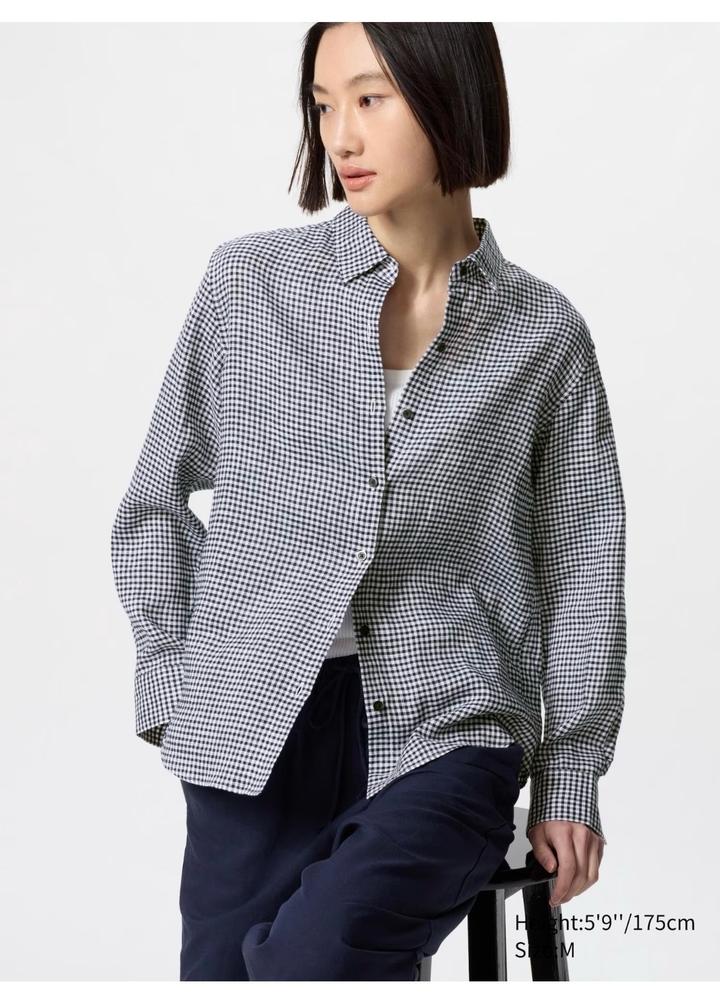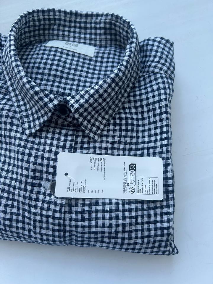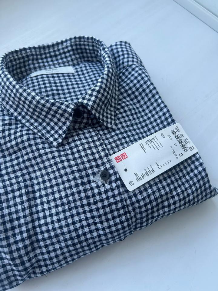 Стильная новая рубашка Uniqlo. В модном принте клетка (темно-синяя с белым). Отличный состав и крой, заказ с Германии 49.9€ 100% premium linen Новая с биркой размер S Артикул: 323747