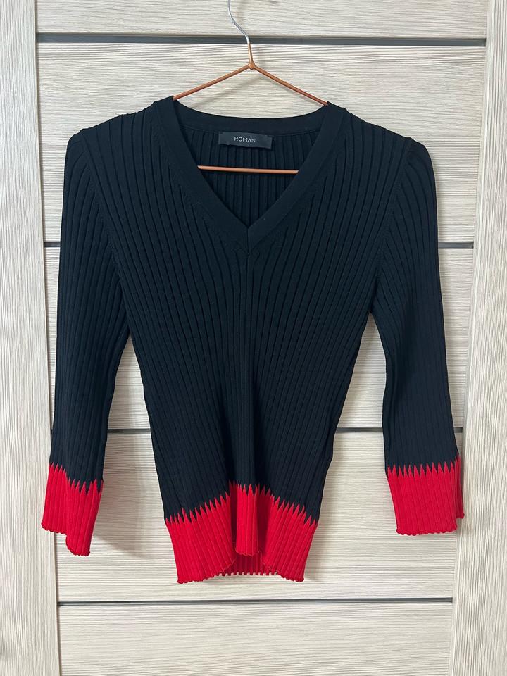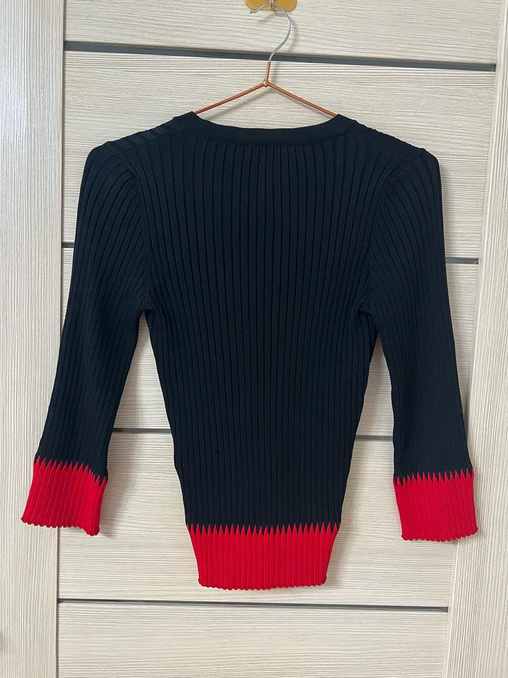 Черная кофта в рубчик с V-образным вырезом. Подходит для XS-S размера. Сделан из вискозы (65%) и полиамид (35%). Артикул: 324604