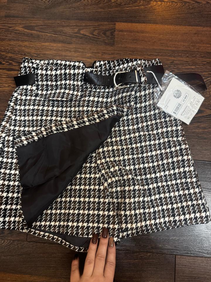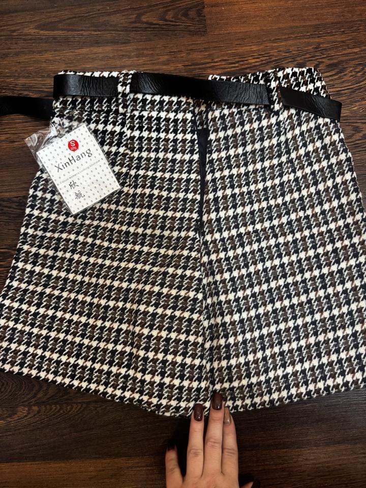 Элегантные шорты в классический черно-белый принт «гусиная лапка». Плотная твидовая ткань отлично держит форму, подчёркивая фигуру. Идут в комплекте с ремнем. Идеально подойдут для осенне-зимнего сезона — можно сочетать с водолазкой, блузкой или свитером. Артикул: 330809