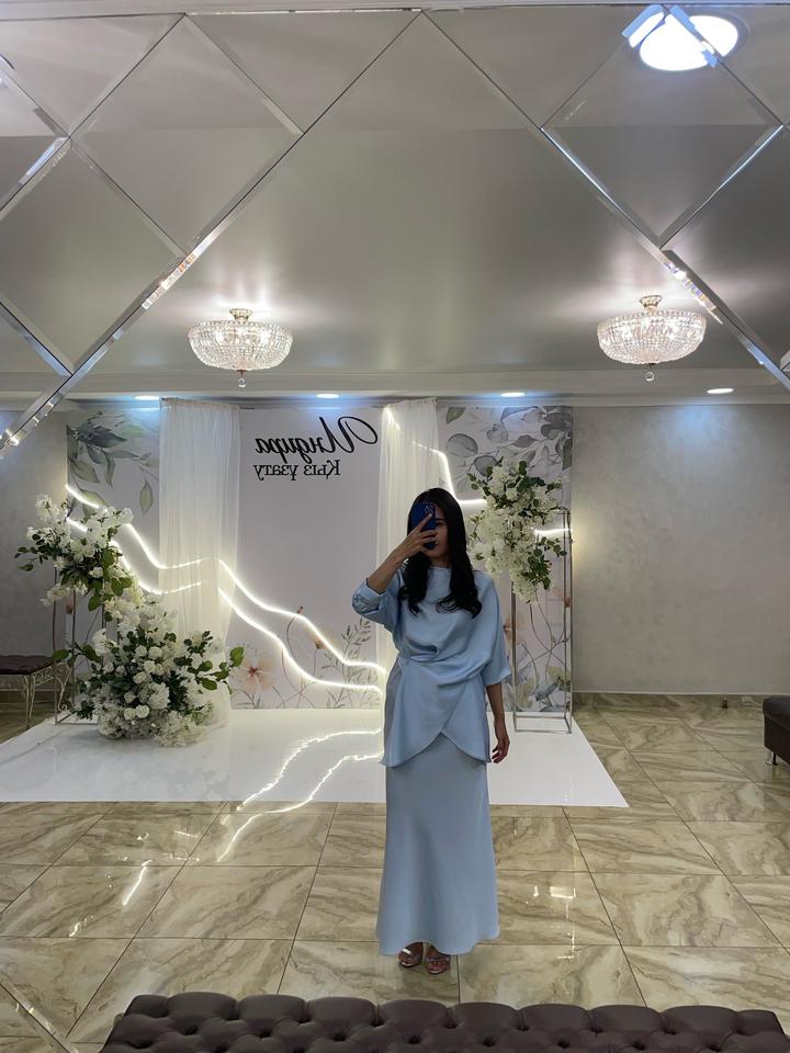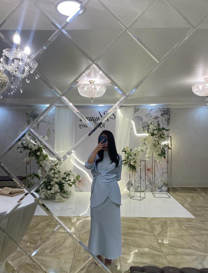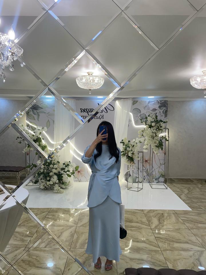 Костюм из атласа нежно голубого цвета, блузка и юбка, при желании можно носить отдельно. Блузка интересно застегивается. Не подчеркивает недостатки фигуры. Одевалось 1 раз. Артикул: 331421