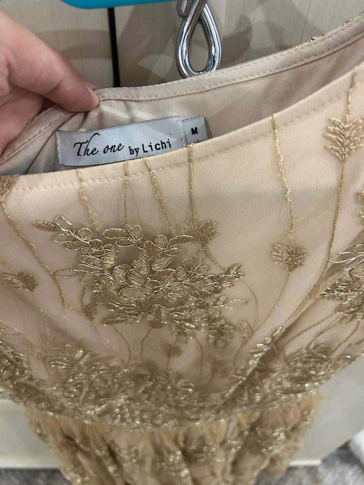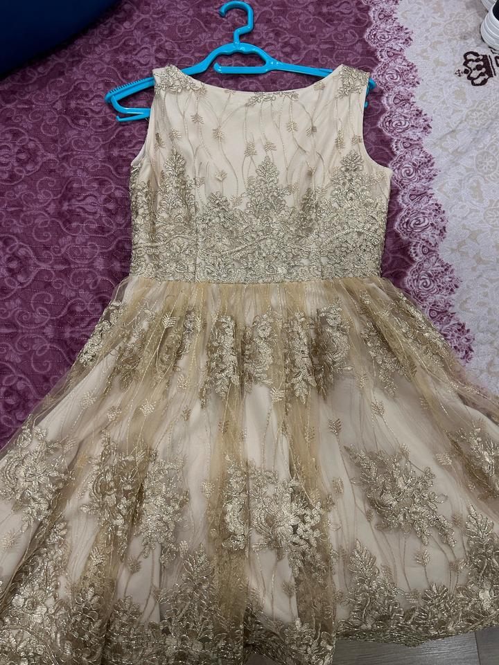 Шикарное вечернее/праздничное платье в бежево-золотом оттенке. Выполнено из плотного подкладочного материала и украшено сверху воздушной сеткой с изысканной вышивкой и блестящими нитями. Платье красиво подчёркивает талию и создаёт лёгкий, женственный силуэт. Подойдёт для выпускного, свадьбы, торжества или фотосессии. Размер: M (ориентировочно на 44–46) Состояние: отличное, надето 1 раз Размер уже не подходит Артикул: 334044