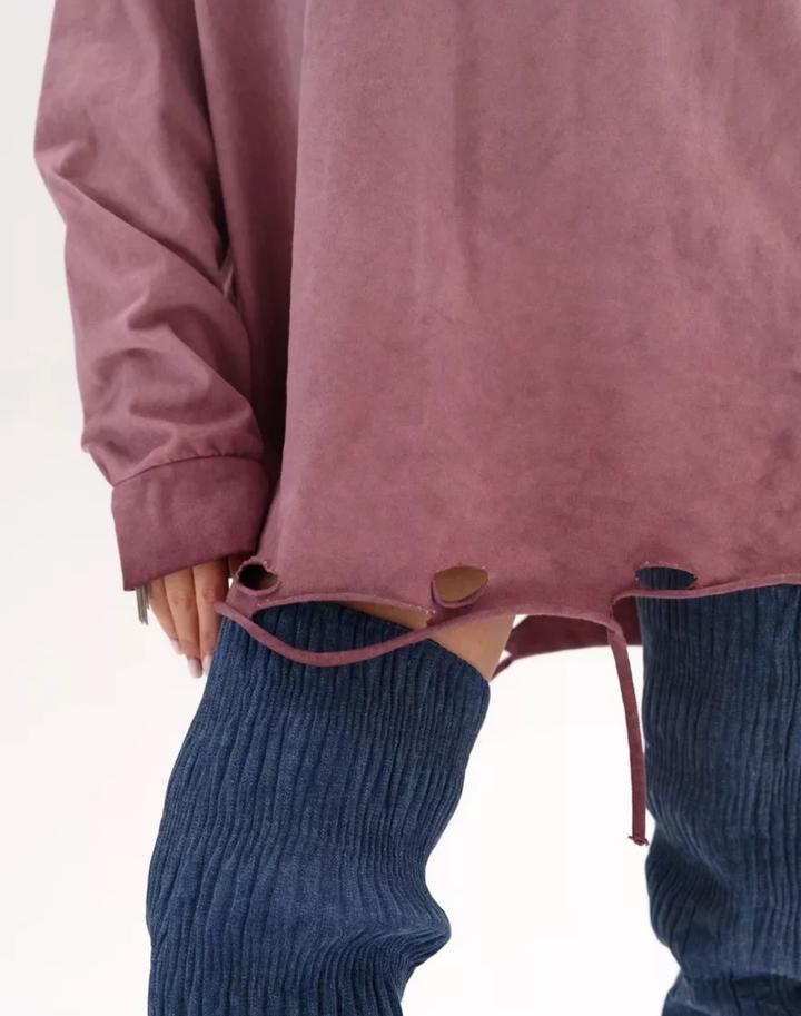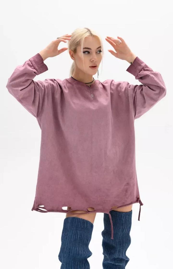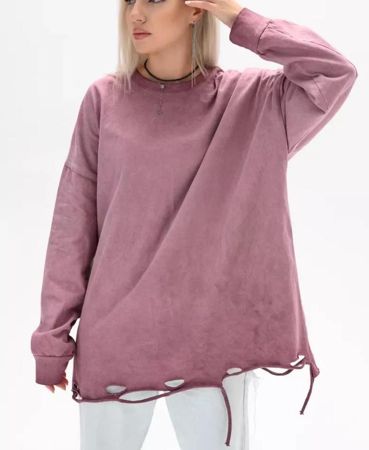 Лонгслив оверсайз, красивого пыльно-розового цвета. Ткань прокрашена неравномерно, разводами (так задумано), рваный подол. Состояние хорошее, надевала один раз. Состав - хлопок. На размер S-M будет смотреться как на фото, оверсайз. Рост модели на фото 170см. Артикул: 335608
