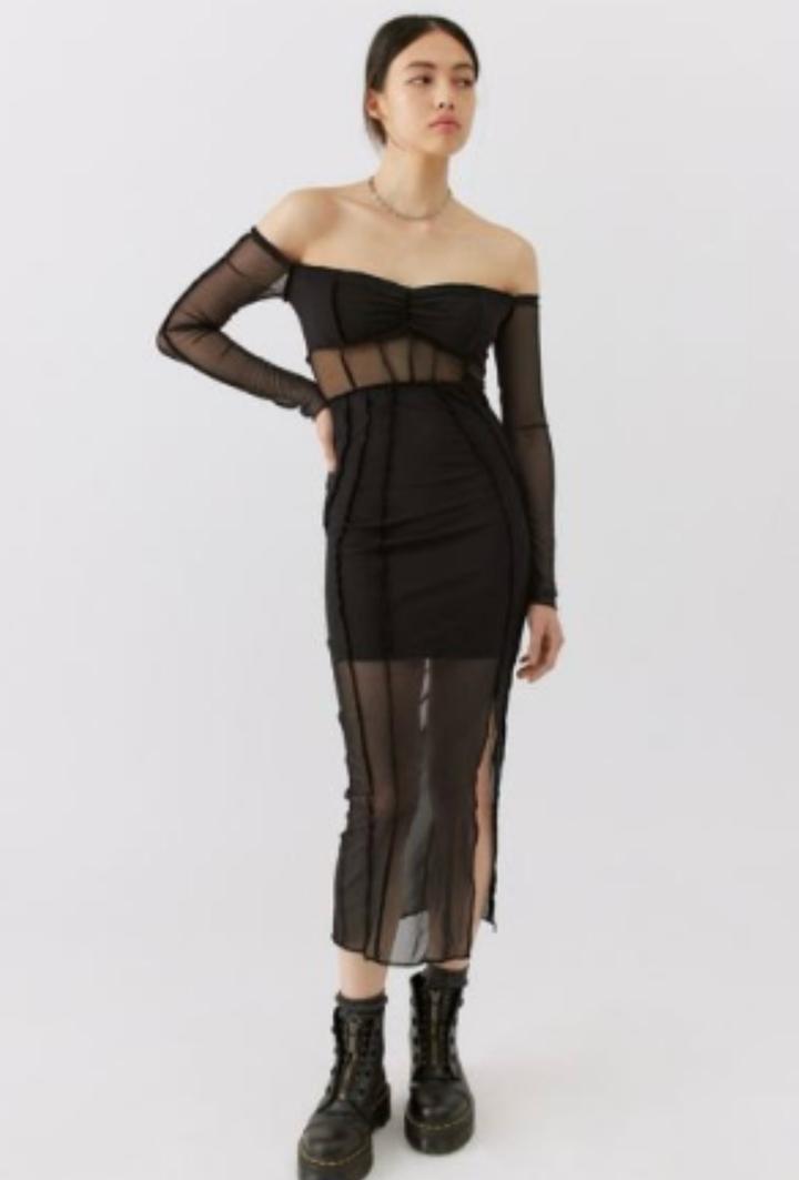 В готическом, альтернативном и гранж стиле, Urban Outfitters платье миди размер46-48, с разрезом, открытыми плечами и прозрачными рукавами. Надевалось бережно. На мне (48L) платье сидит очень по фигуре, а на 44–46(S-M) придаст более лёгкую, струящуюся посадку. Артикул: 341095