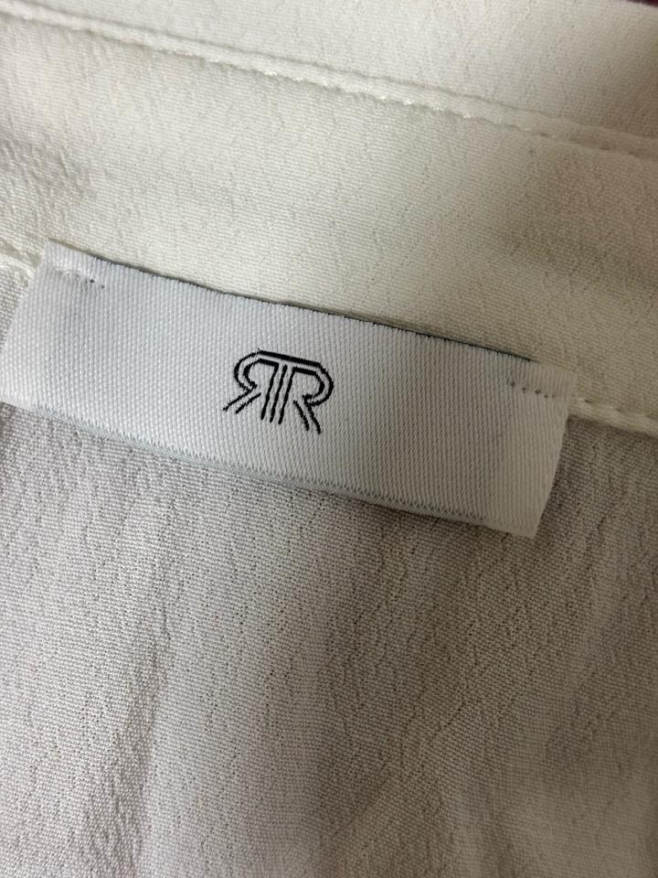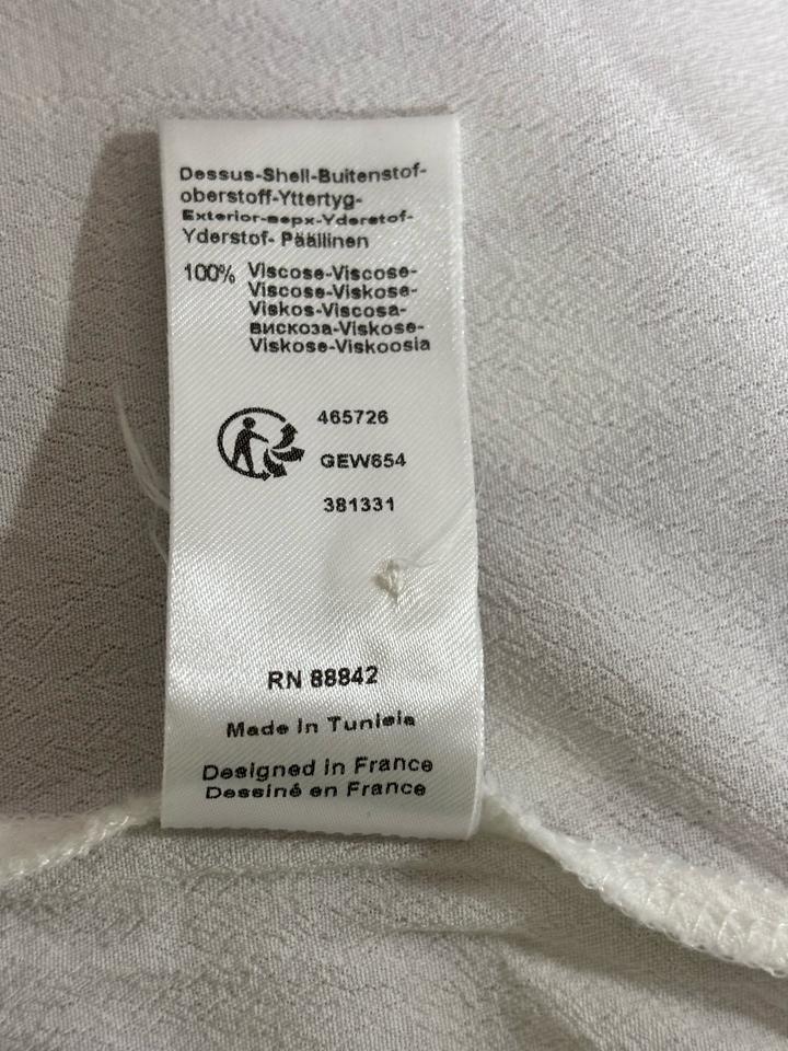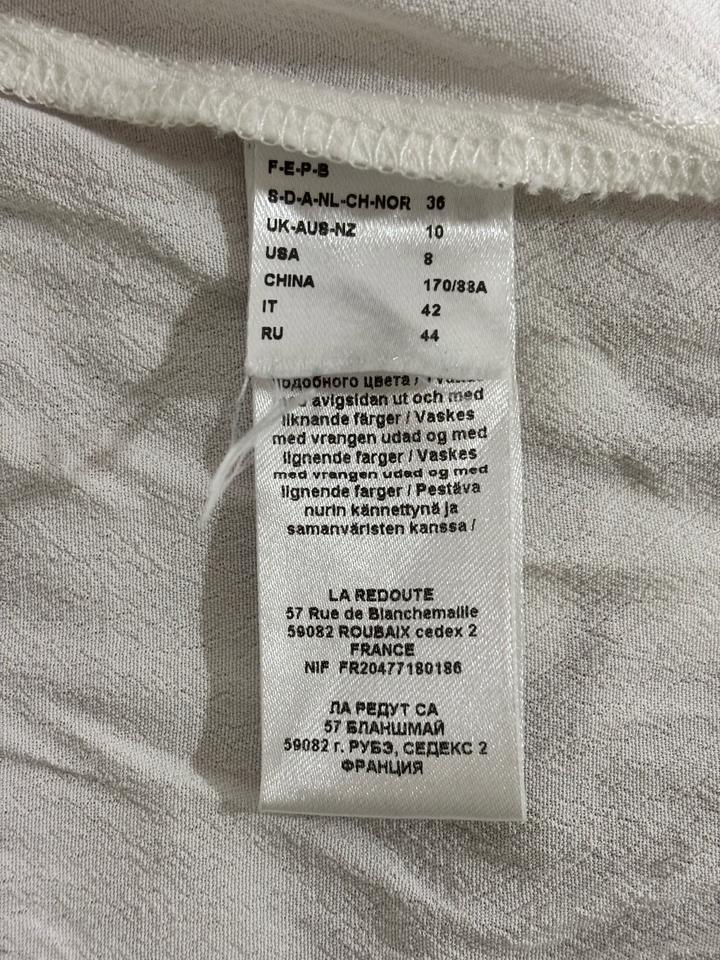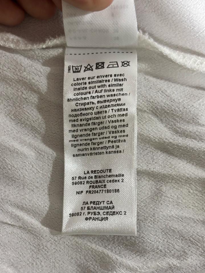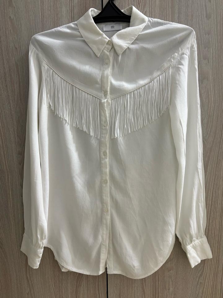 Это белая женская рубашка с длинными рукавами и воротником-стойкой. Особенность модели — декоративная бахрома на груди, проходящая по диагонали от плеч к центру, создающая стиль вестерн (ковбойский) стиль. Рубашка от французского бренда La Redoute. Артикул: 341714