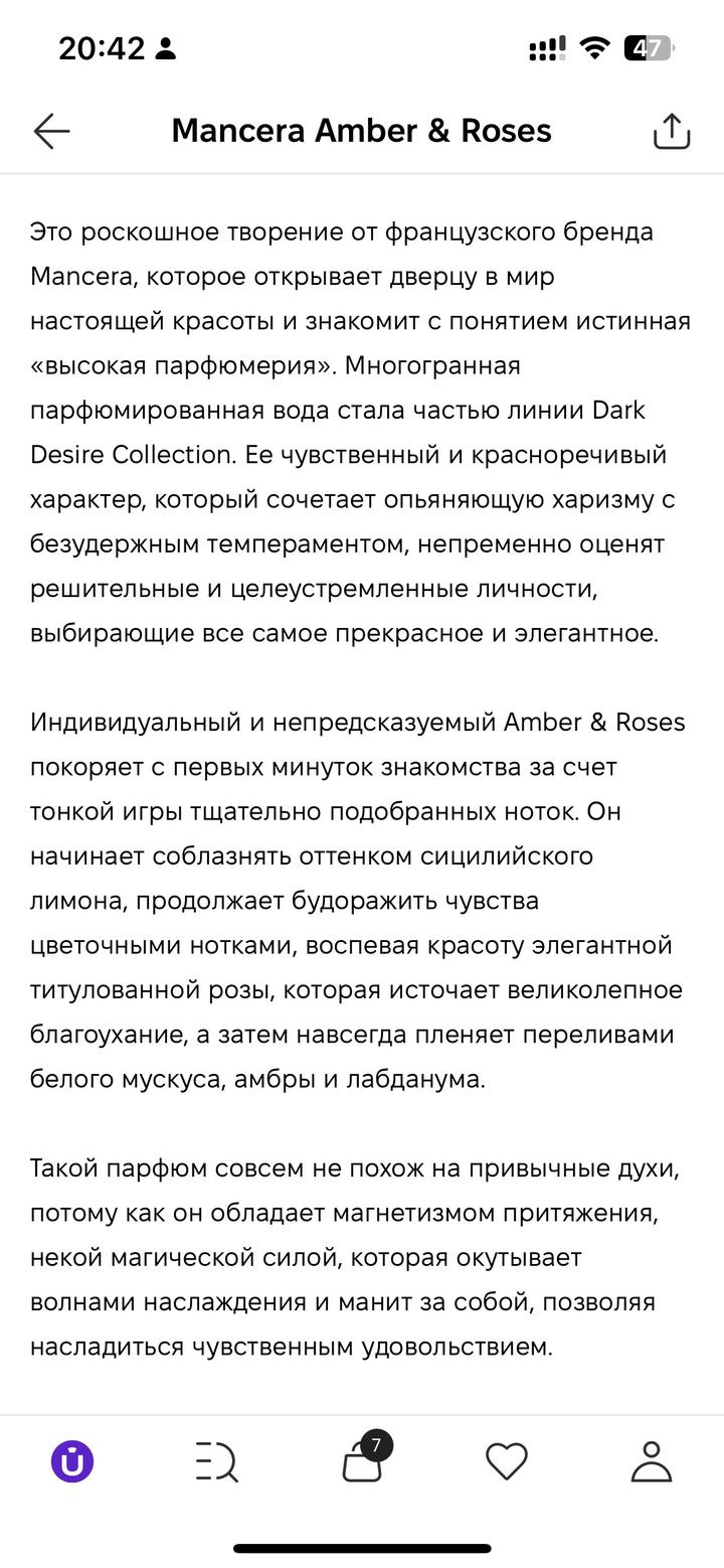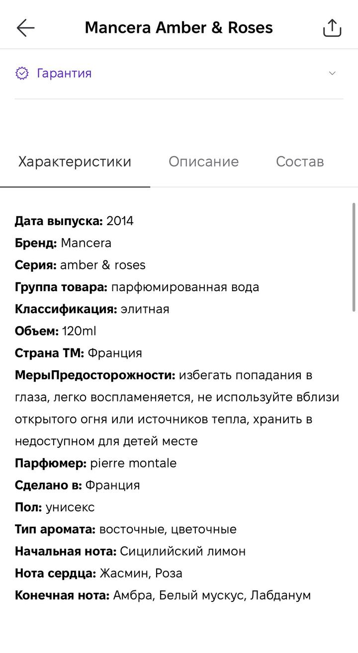 Мancera amber & roses Из 120 мл осталась половина парфюма Стойкий / унисекс Больше интересных вещей у меня в профиле , заглядывай 💛 Приятных покупок 💛 Благодарю что уделили время и внимание моей страничке 💛 Артикул: 347534