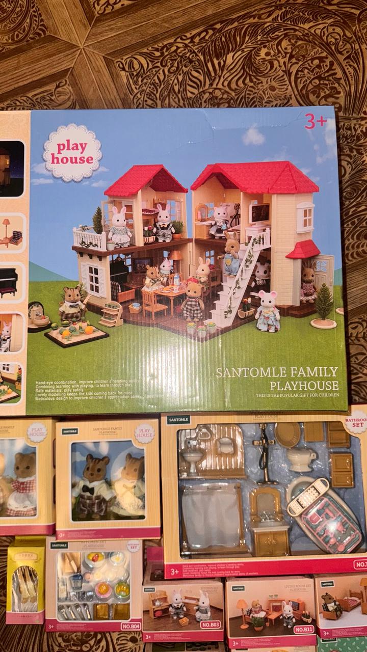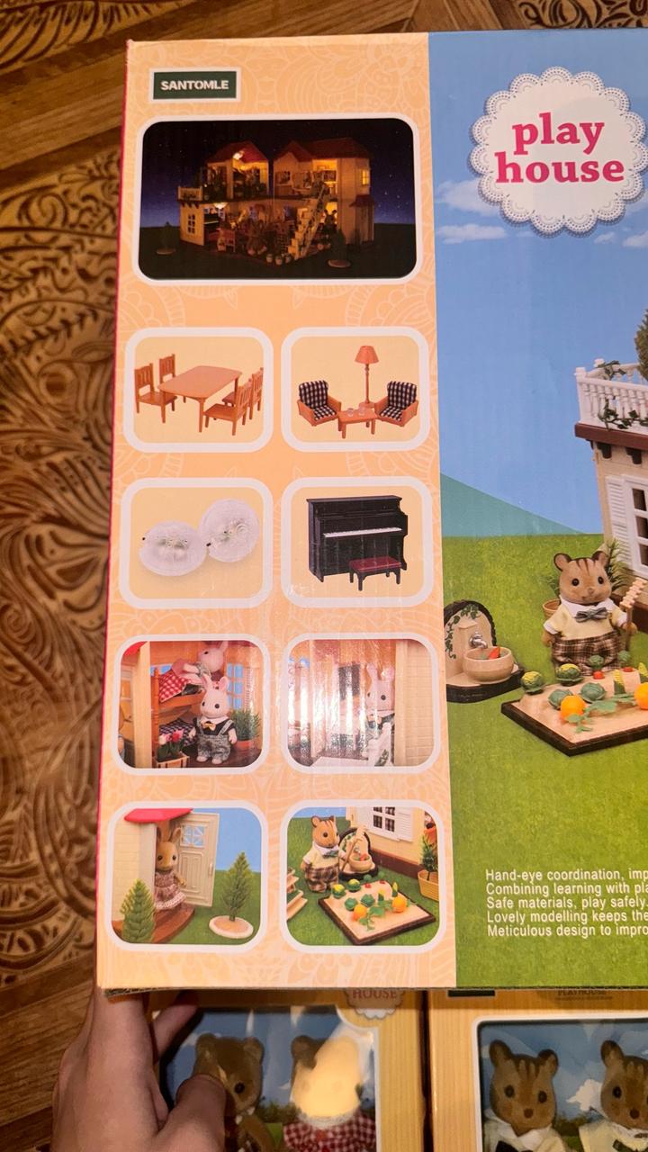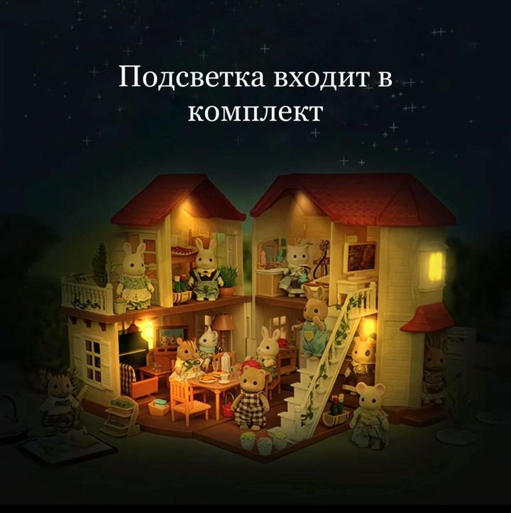 В продаже большой кукольный дом, точная копия sylvanian families, с милашейшими фигурками животных и мебелью в комплекте. Идеальный подарок на Новый год или день рождения ребенка. Домик двухэтажный, имеет подсветку, можно открыть/закрыть, есть 5 просторных комнат ванная комната, спальня, зал, столовая, кухня, при этом вся нужная мебель и аксессуары входят в стоимость, ничего докупать не нужно, так же в комплект входят наборы животных, цена на озон 96к Артикул: 348424
